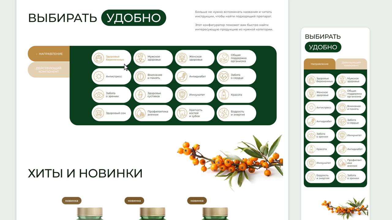На сайте реализован интерактивный конфигуратор, который помогает пользователям быстро находить БАДы по назначению. Это делает процесс выбора удобным и наглядным.