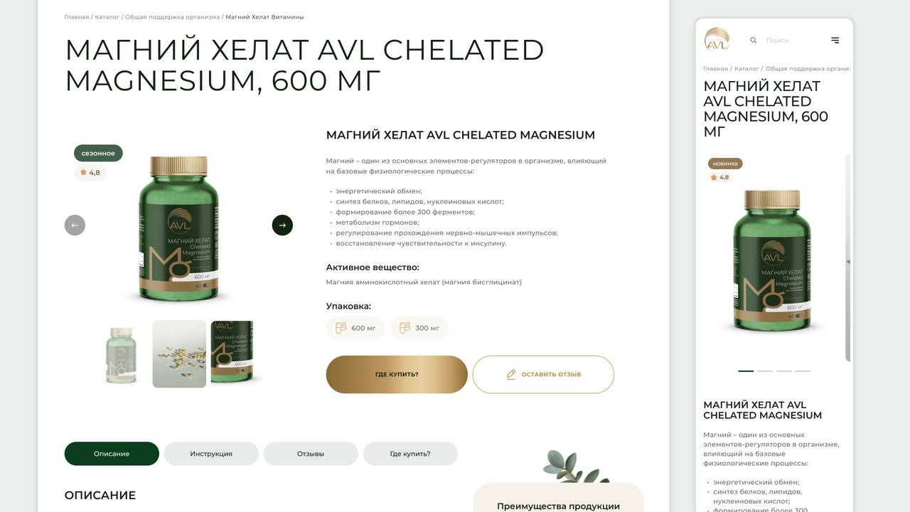 Каждая карточка продукта содержит развернутое описание, активные вещества и рекомендации по применению. Реализована возможность выбора упаковки, кнопки "Где купить?" и "Оставить отзыв".