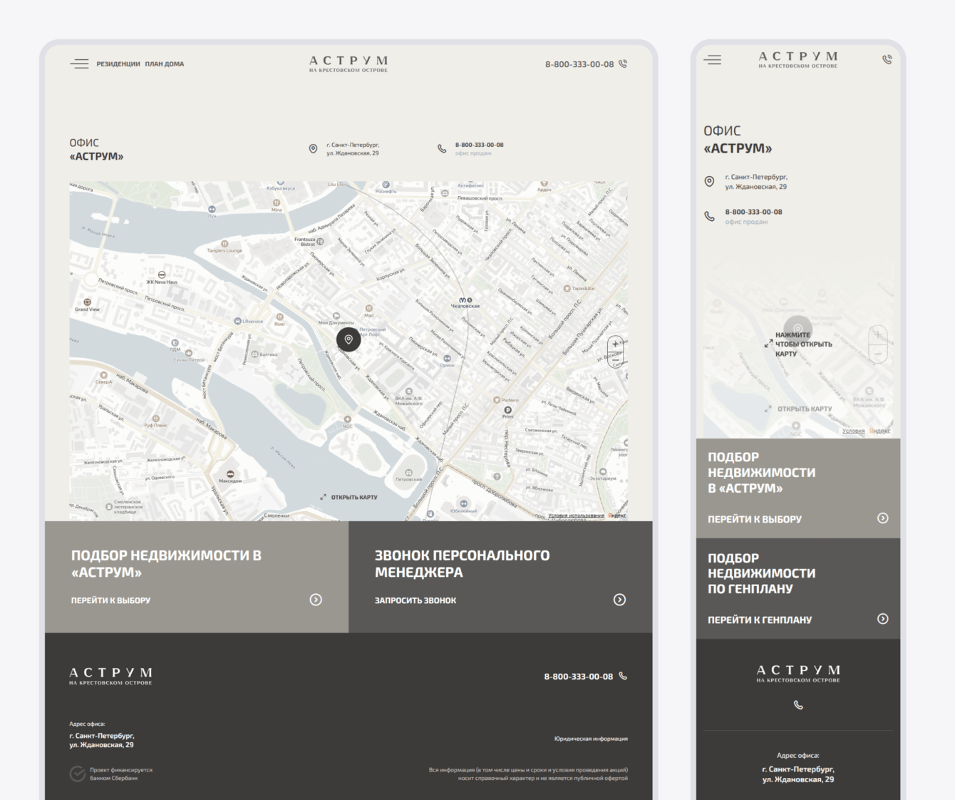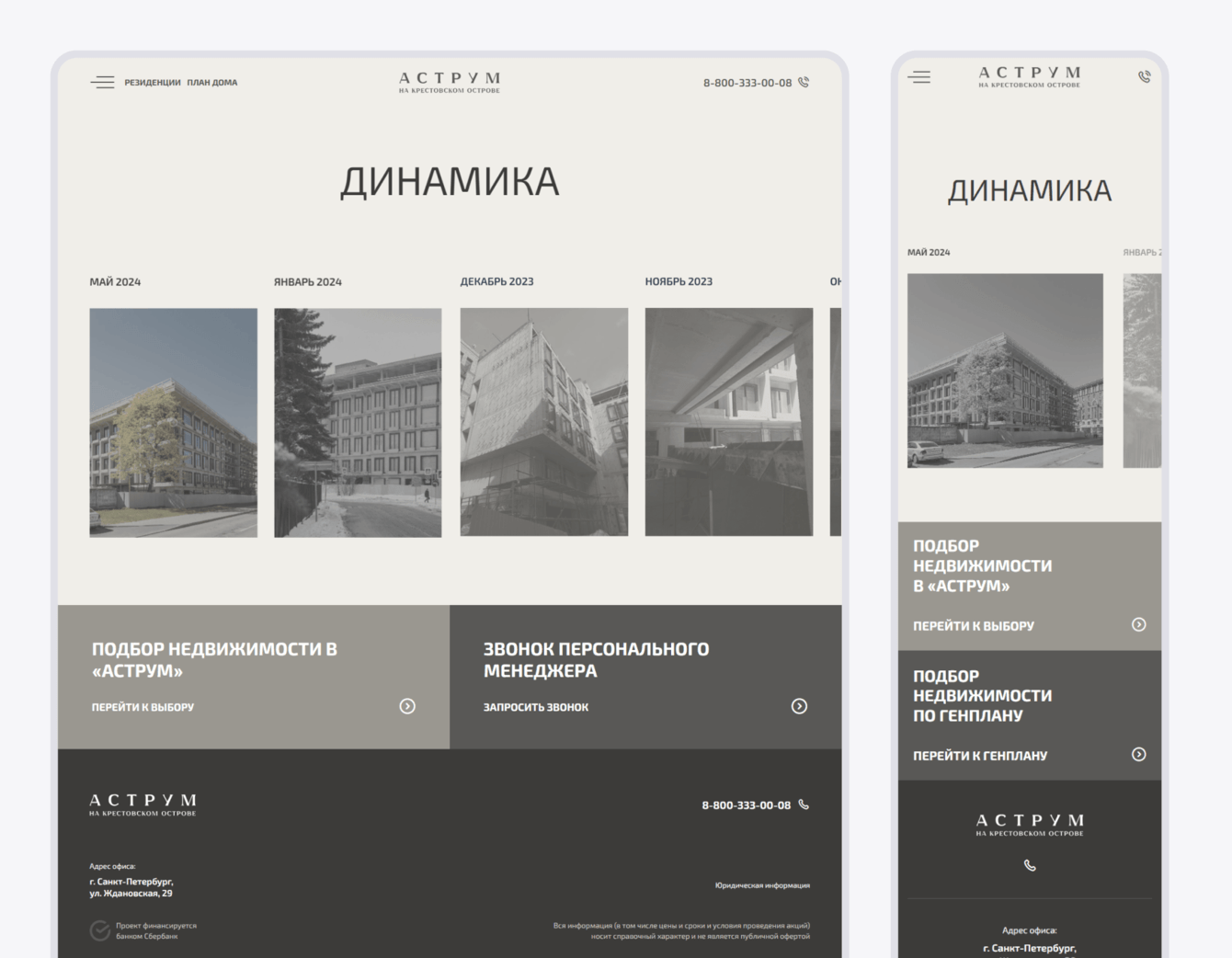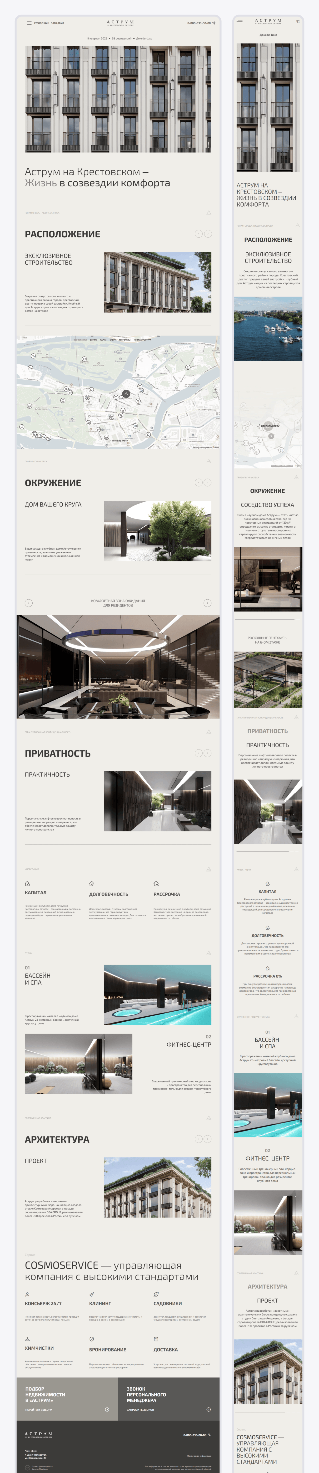 Лаконичный сайт в брендовых цветах для Клубного дома "Аструм" в Санкт-Петербурге. Функционал и блоки с акцентом на визуальную составляющую ненавязчиво знакомят пользователя с проектом. Заявки с форм и статусы помещений обновляются в режиме реального времени благодаря интеграции с amoCRM.