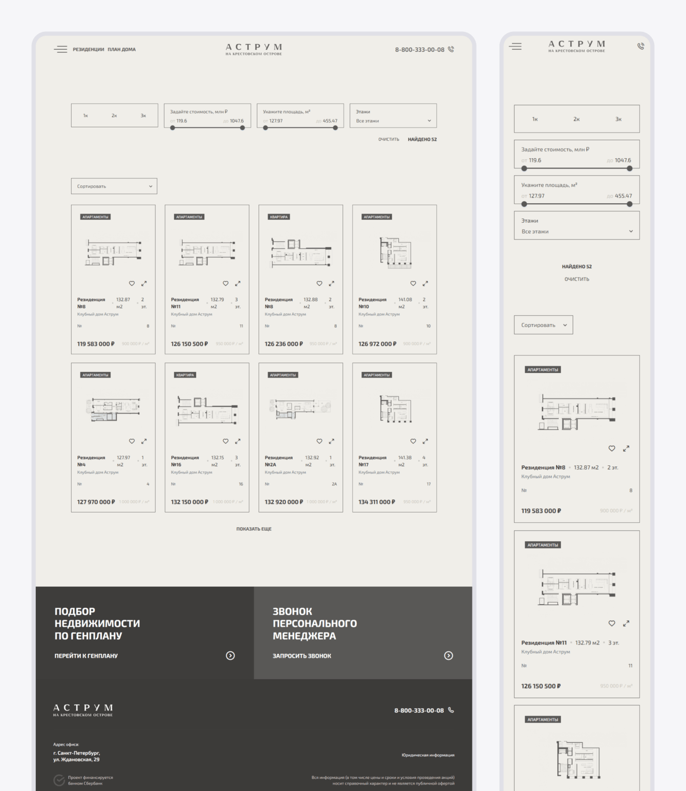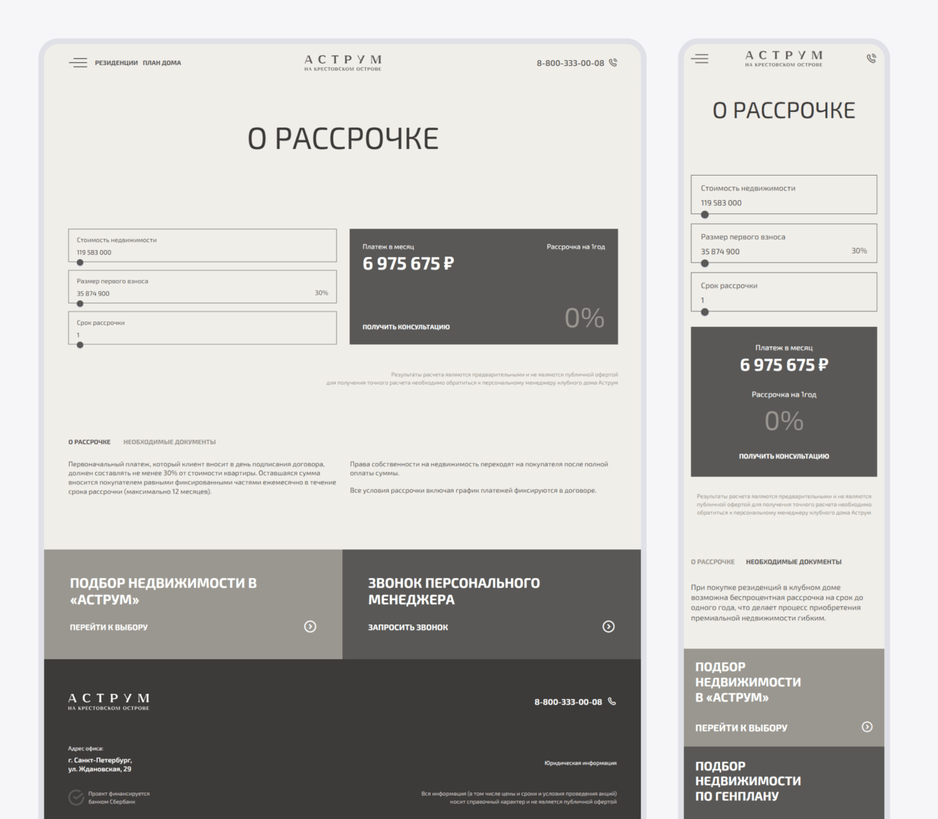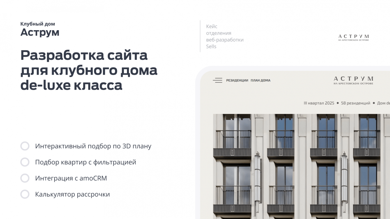 Лаконичный сайт в брендовых цветах для Клубного дома "Аструм" в Санкт-Петербурге. Функционал и блоки с акцентом на визуальную составляющую ненавязчиво знакомят пользователя с проектом. Заявки с форм и статусы помещений обновляются в режиме реального времени благодаря интеграции с amoCRM.