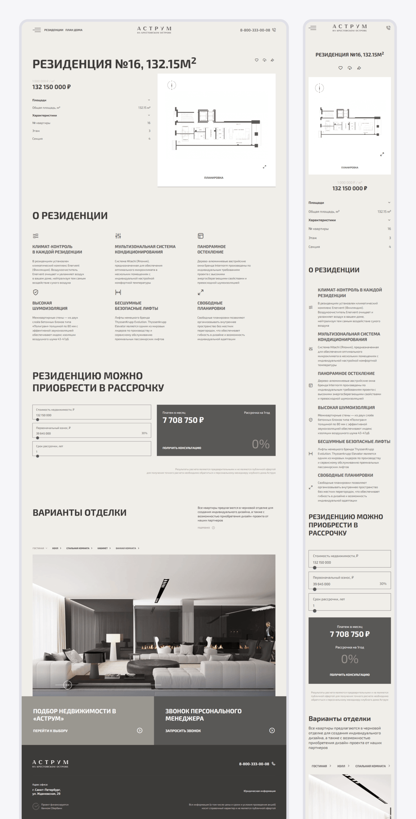 На странице представлена подробная информация о помещении. Пользователь может скачать информацию о резиденции PDF-файлом. Также на странице расположен калькулятор рассрочки и галерея с вариантами отделки.