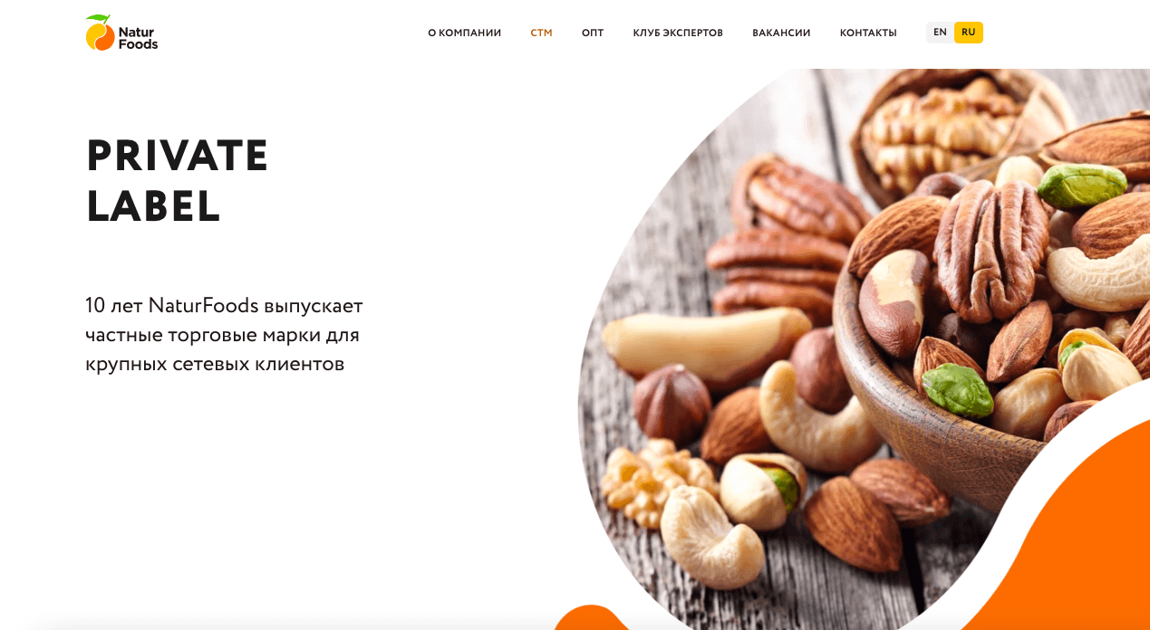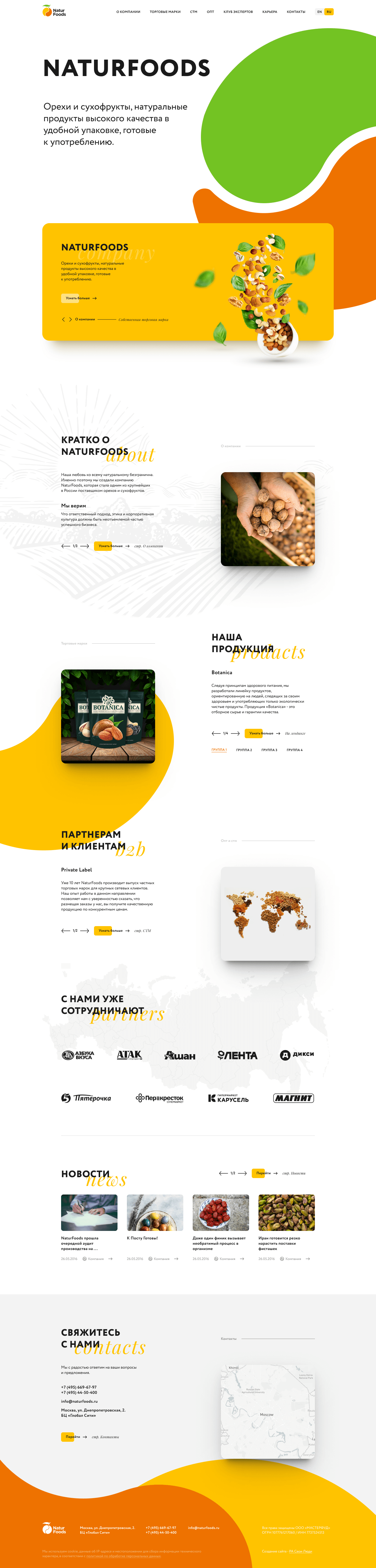 Разработка сайта компании NaturFoods для конечного потребителя – представить все торговые марки компании: NaturFoods, Botanica, Snack&Go, SnackFRU и для партнеров – показать возможности компании по созданию СТМ под заказ.