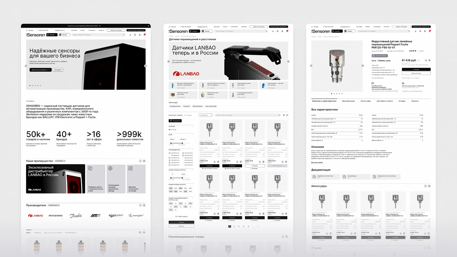 К процессу разработки мы подошли комплексно. Так как это не просто одностраничник, а большой e-commerce проект, где важно учесть все нюансы. Чтобы пользователь легко переходил от каталога к карточке и оформлению заказа, не теряя контекст. На этапе UX-проектирования определили пользовательские персоны, сценарии и структуру, что позволило сделать навигацию логичной и сокращающей путь до целевых действий. Затем полностью обновили визуальный стиль, сделав его современнее, и внедрили стилистику новой айдентики. Работа над интерфейсом велась в тесной коллаборации с командой Sensoren, включая SEO-специалистов.