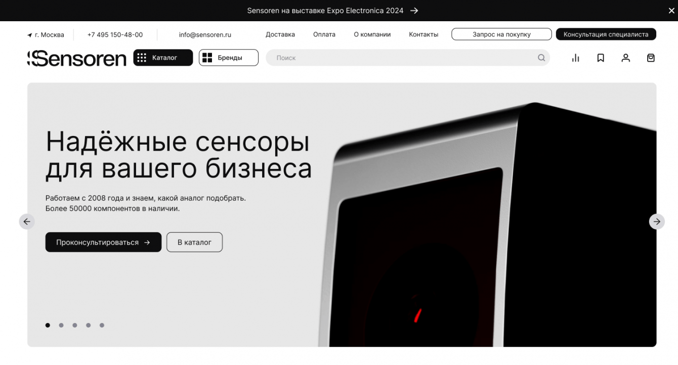 Уже с первого экрана видно четкую и понятную структуру, которая максимально упрощает навигацию. Отсутствие визуального шума помогает сконцентрироваться на самом главном. А фирменная монохромная палитра и специально разработанные для проекта фотореалистичные 3D изображения датчиков и сенсоров раскрывают и подчеркивают технологичность и профессионализм компании.