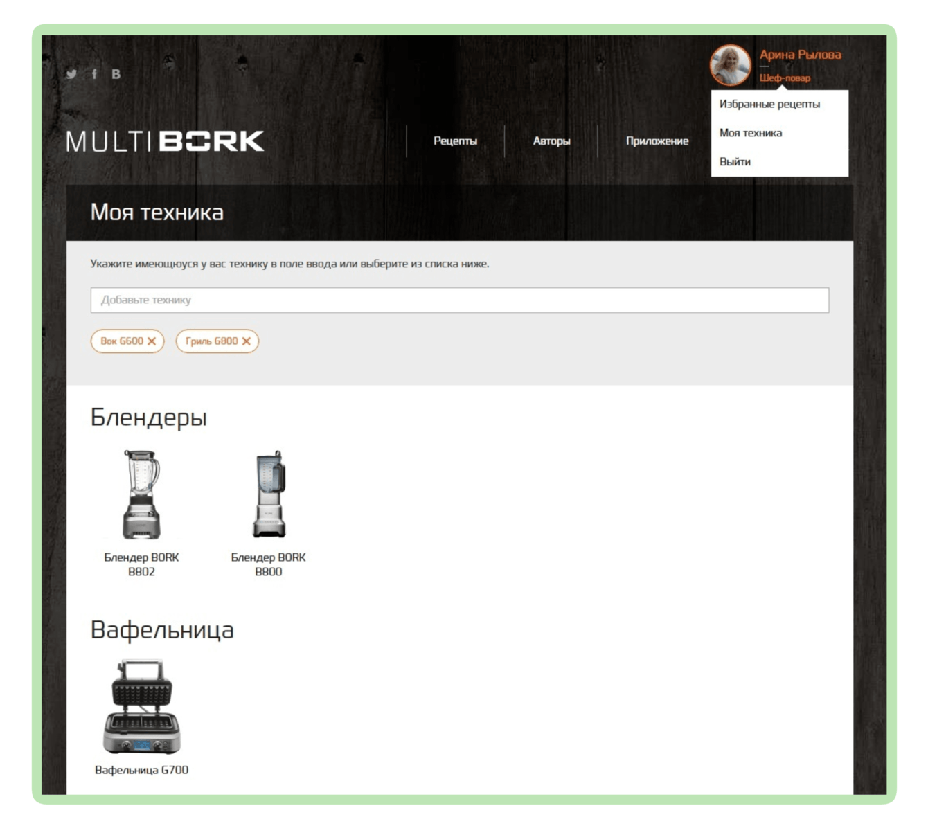 Персональные разделы "Моя техника" и "Избранные рецепты" улучшают пользовательский опыт. Пользователи собирают все рецепты по купленной технике в одном месте. За счет цифрового формата, эти рецепты никогда не потеряются.