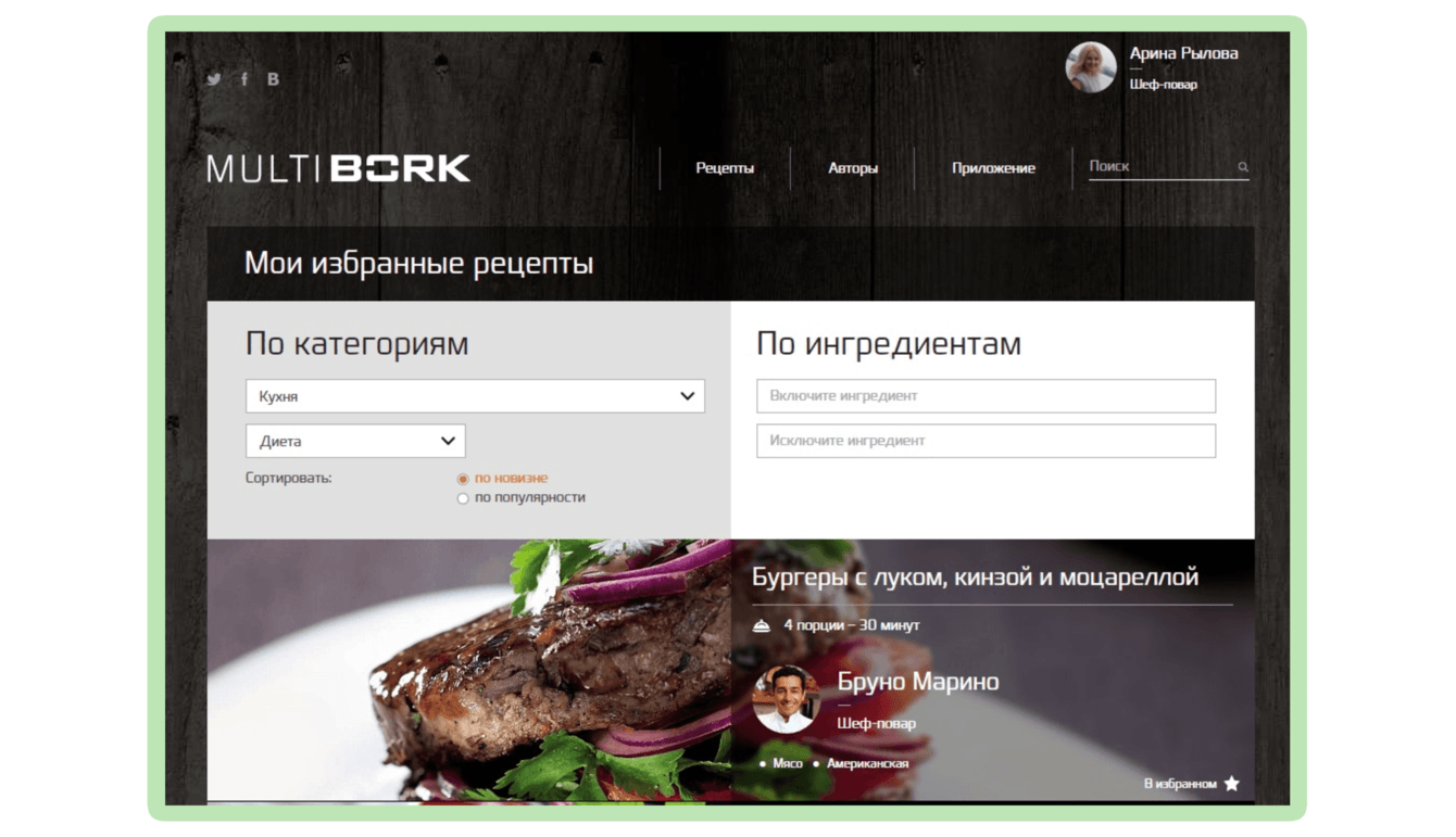 Также разработали личный кабинет, настроили авторизацию через Facebook, сделали поиск по технике и ингредиентам, подготовили API для интеграции сайта с мобильным приложением, сделали раздел с избранными рецептами.