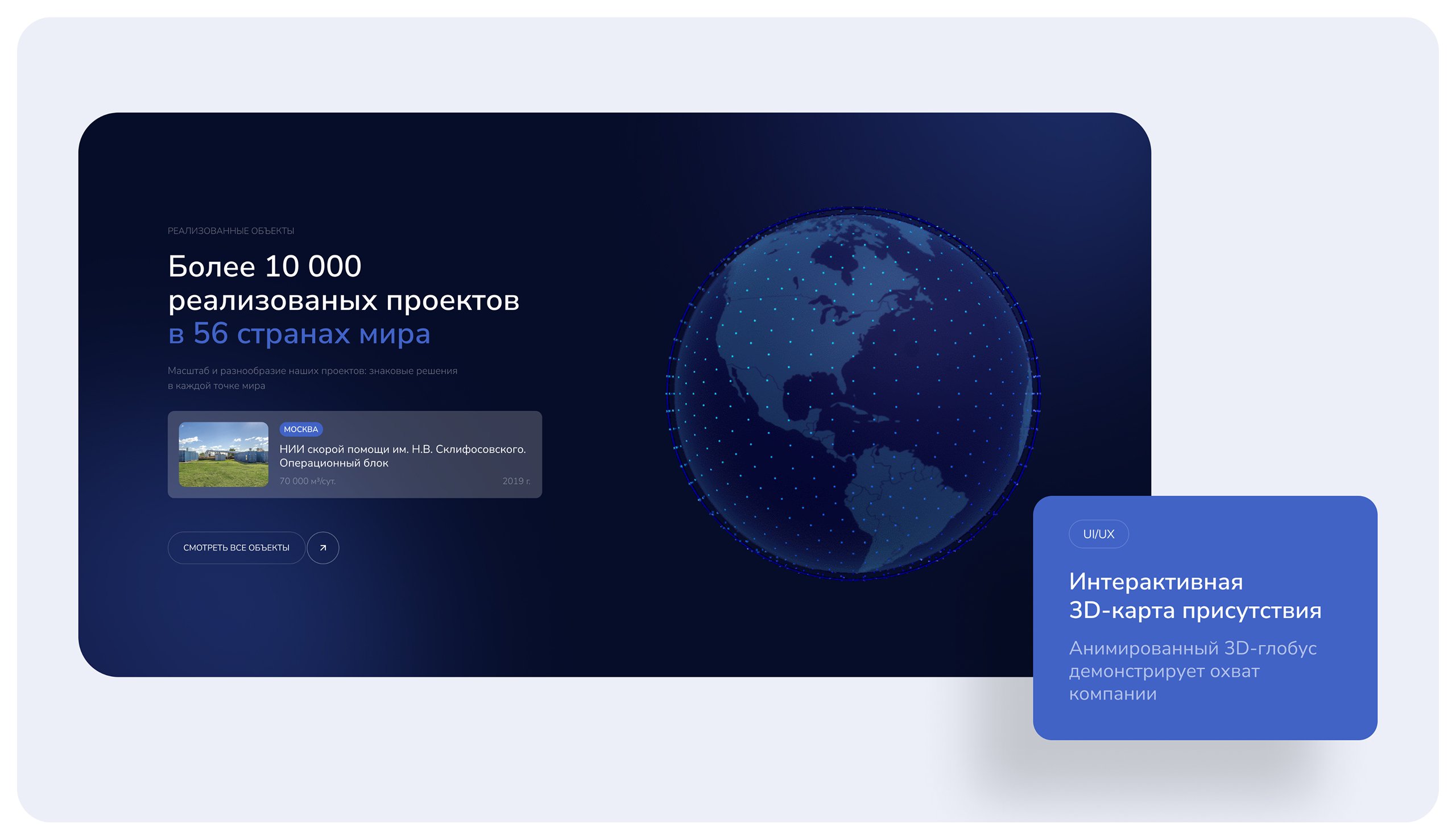 Чтобы продемонстрировать масштабы деятельности компании, мы представили реализованные проекты и кейсы по всему миру. Каждый проект сопровождается подробным описанием и примерами решений.
