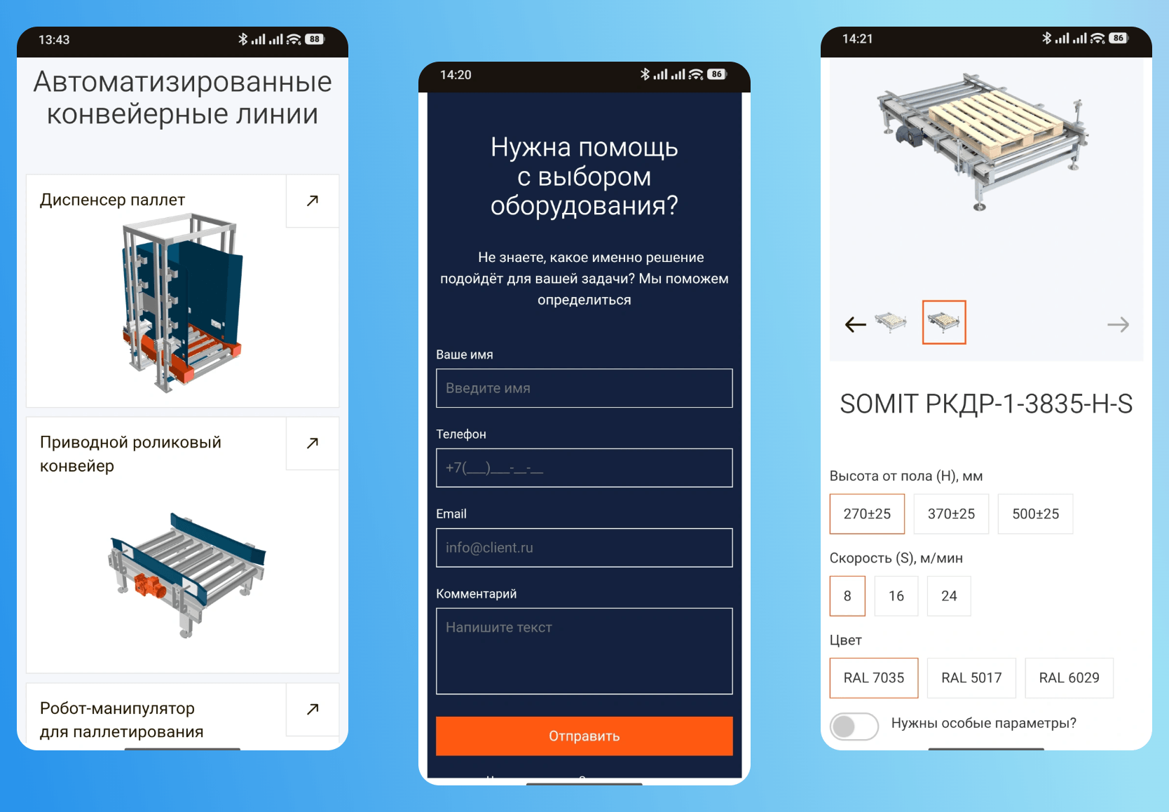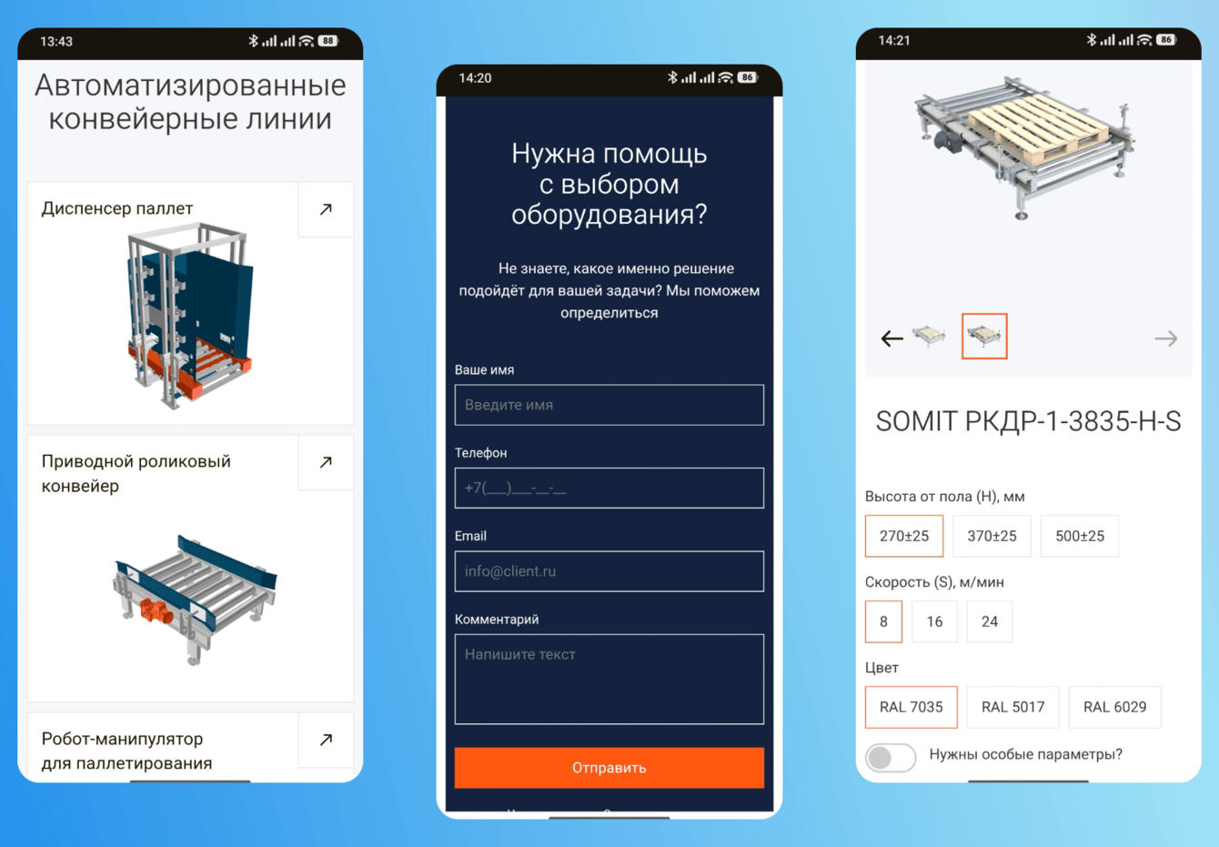 Мы разработали сдержанный, технологичный фирменный стиль, отражающий инженерный подход и точность компании. Для главного экрана спроектировали анимацию, наглядно демонстрирующую экосистему типовых конвейерных модулей. Также был реализован каталог оборудования с возможностью выбора параметров, отображением стоимости, описанием ключевых характеристик и визуализацией узлов соединения оборудования.