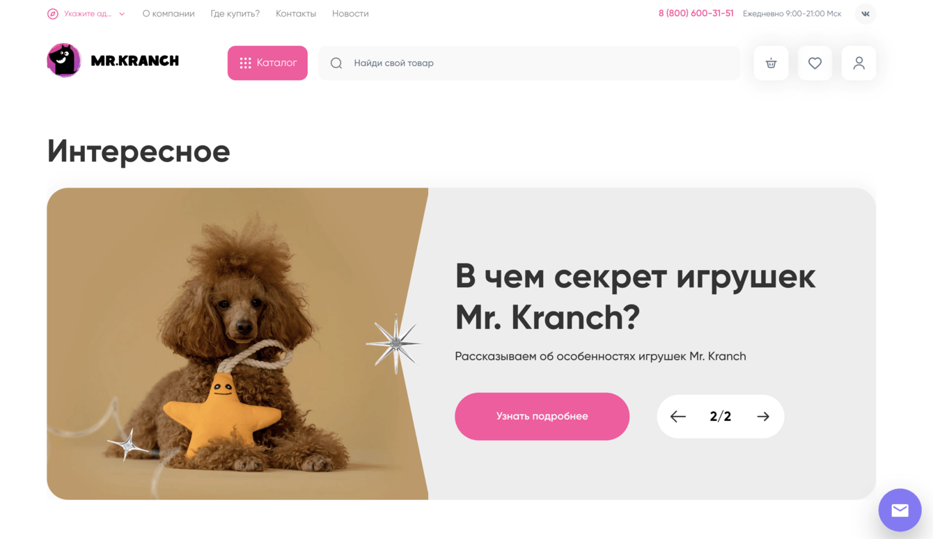 mr kranch — бренд, который продаёт стильные, качественные и безопасные игрушки и аксессуары для животных. Задача — создать интернет-магазин, сочетающий яркий визуальный стиль с удобным каталогом и современным пользовательским опытом.