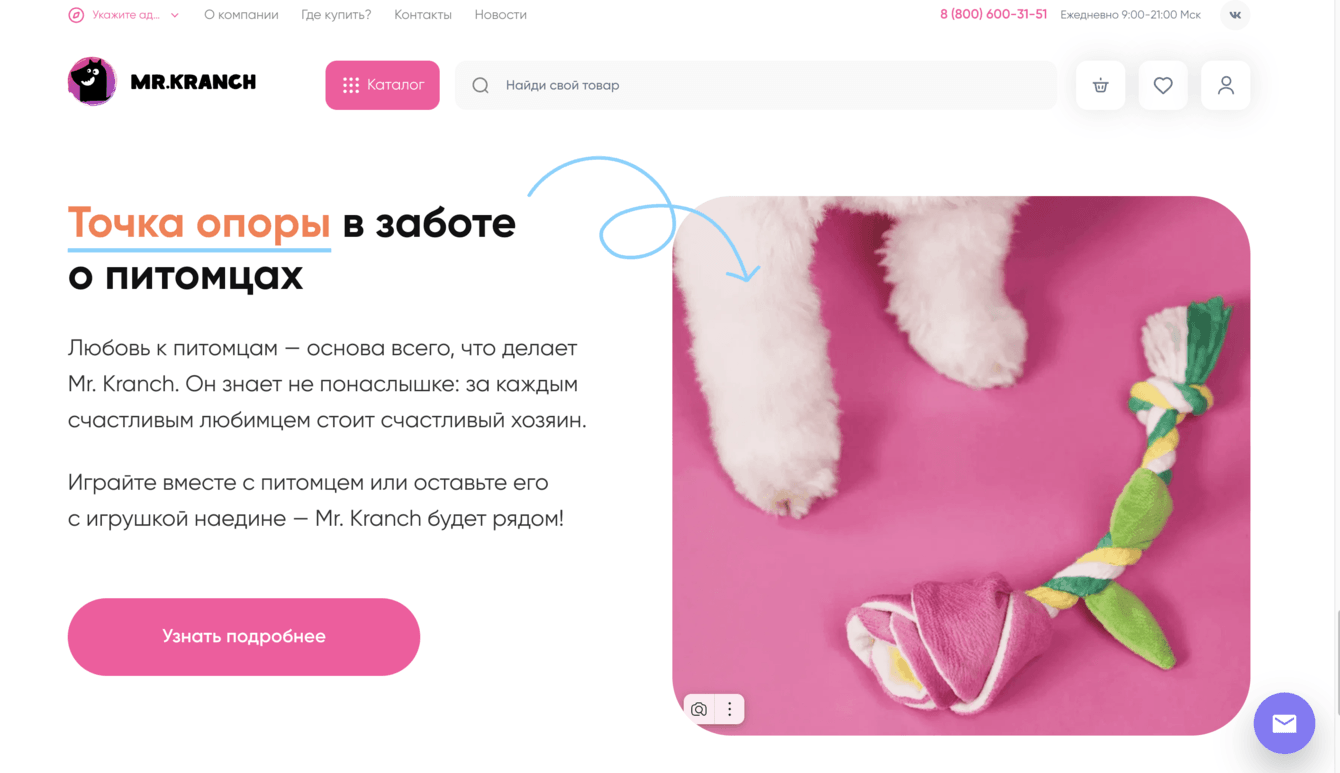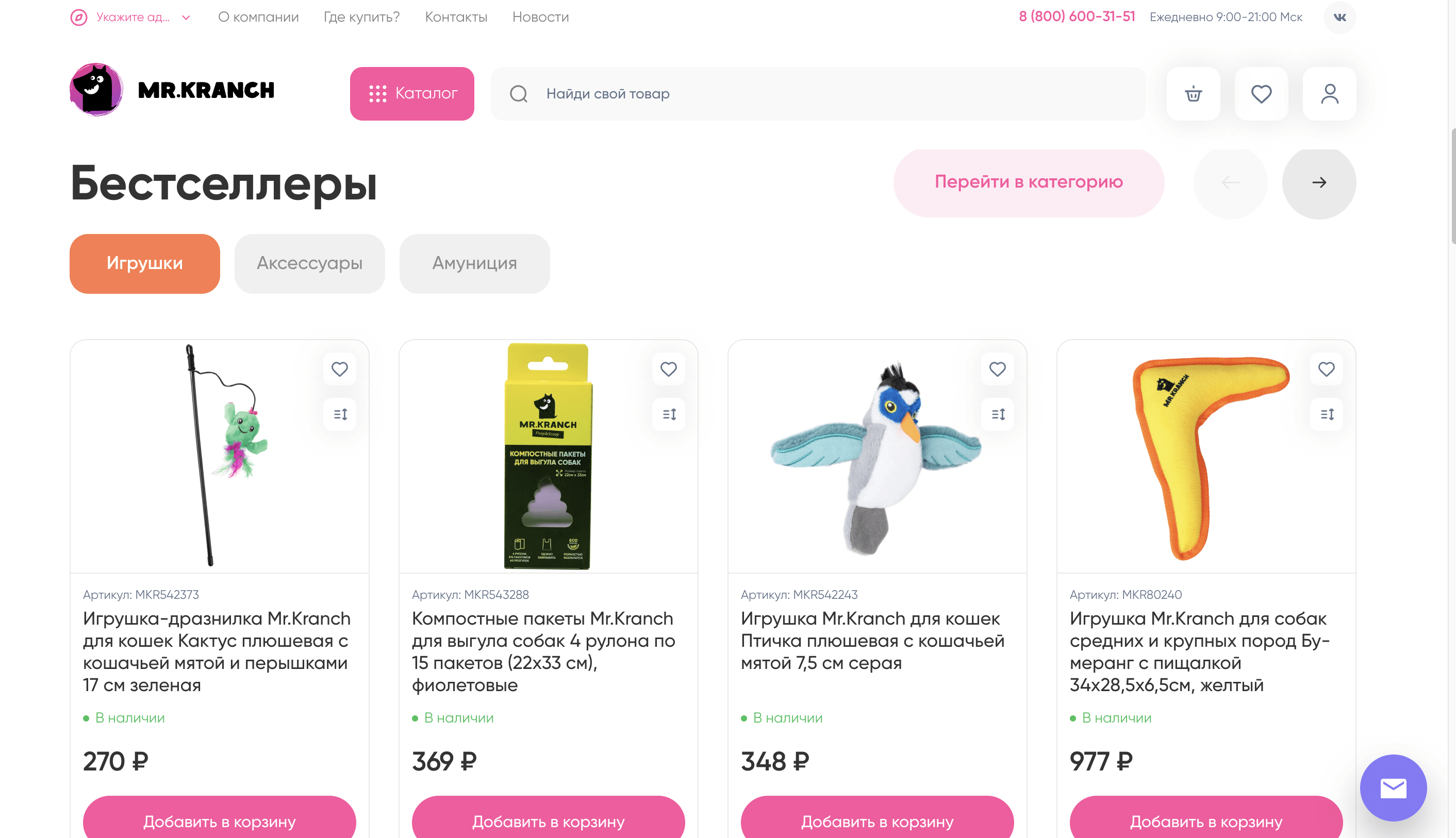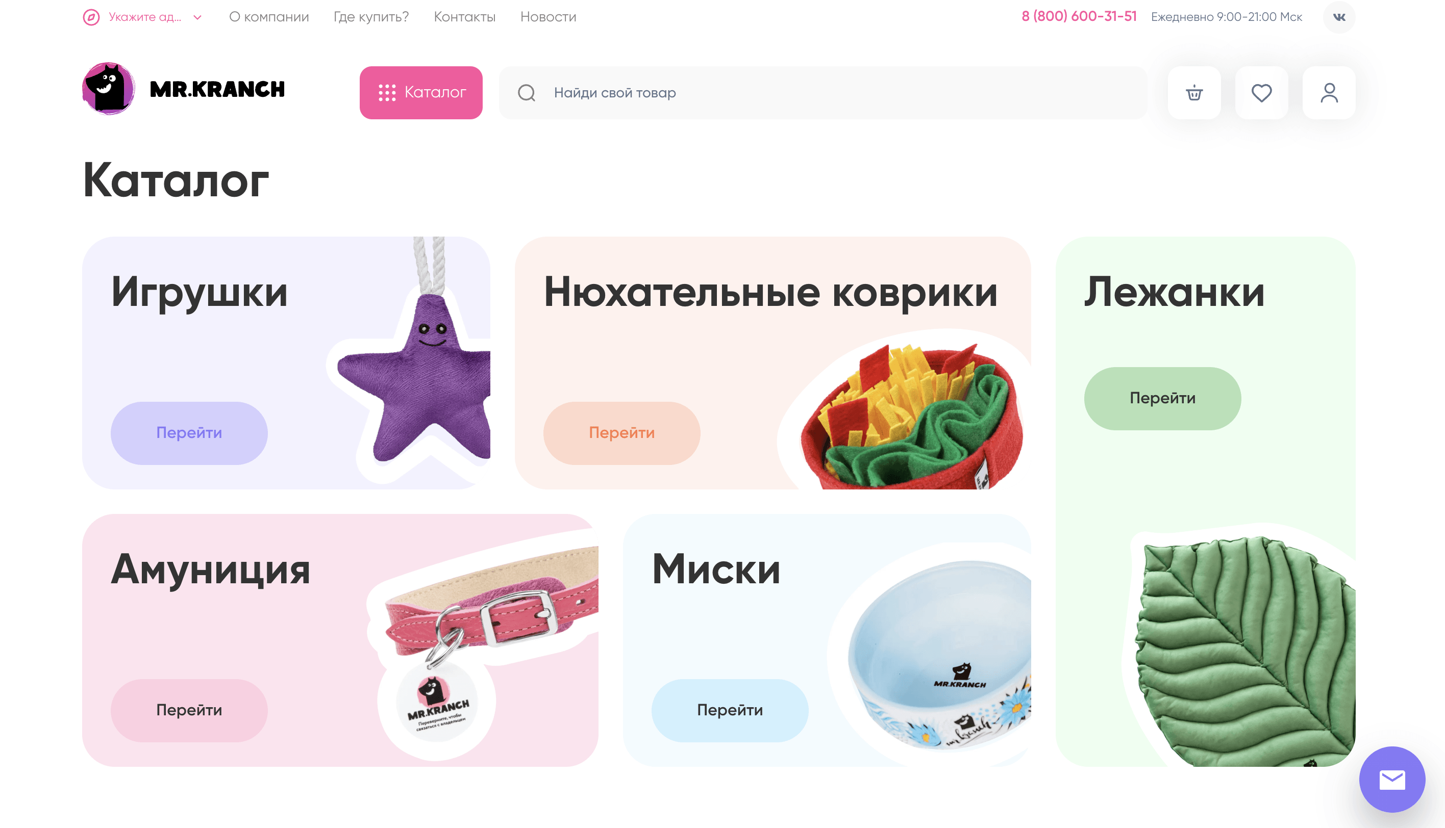 mr kranch — бренд, который продаёт стильные, качественные и безопасные игрушки и аксессуары для животных. Задача — создать интернет-магазин, сочетающий яркий визуальный стиль с удобным каталогом и современным пользовательским опытом.