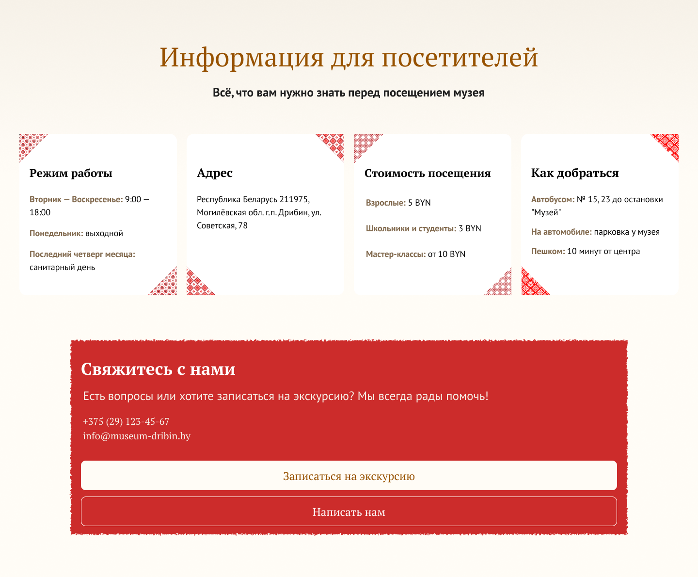 Раздел “Контакты / Записаться” с формами для записи на экскурсии и мастер-классы.
