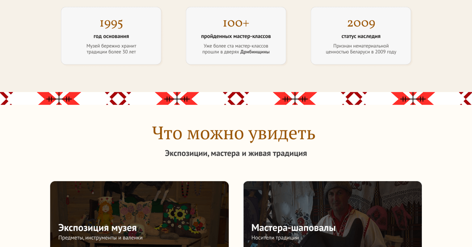 Представить актуальную афишу мероприятий и упростить доступ к экспозициям, мастерам и живой традиции.