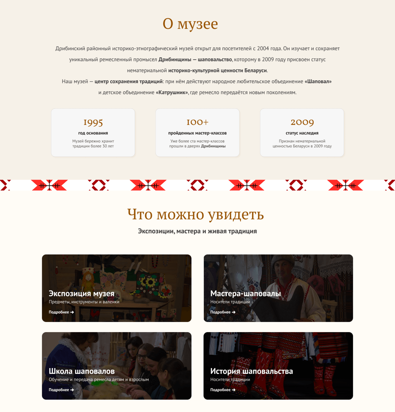 Раздел “Что можно увидеть” — экспозиции, мастер-классы и живые традиции.