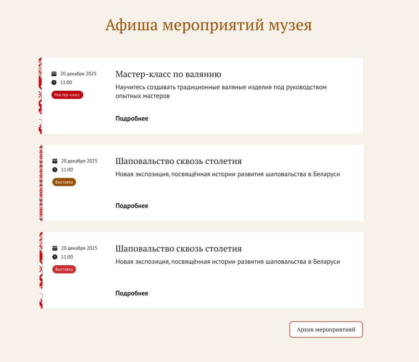 Шаблоны: карточка мероприятия, страница экспозиции, страница мастер-класса.