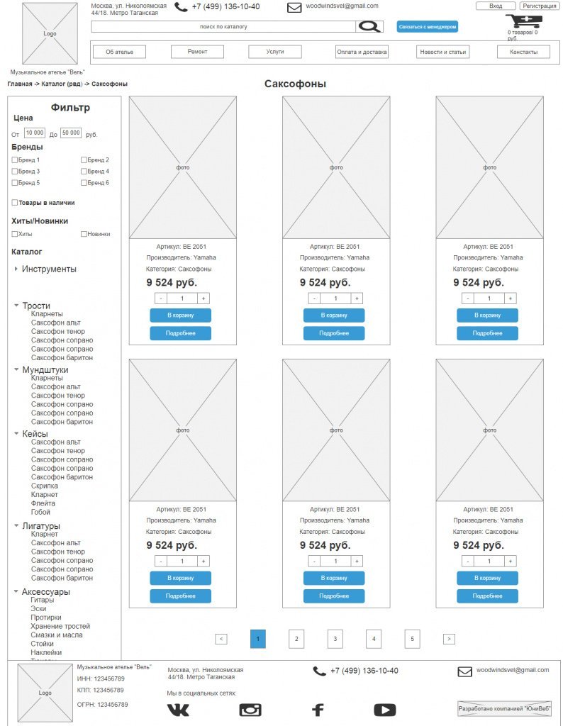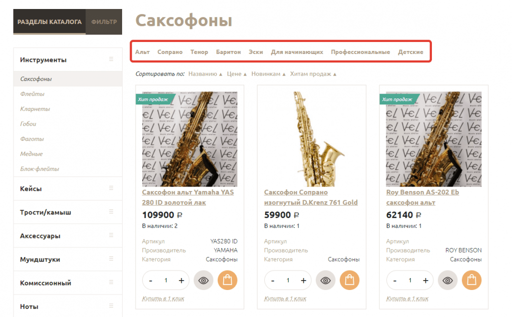 Были созданы дополнительные подразделы, которые позволяют разбить каталог по параметрам, выходящим за пределы стандартной фильтрации по техническим характеристикам инструментов. К примеру, были созданы разделы с товарами, подходящими для детей, для начинающих и для профессионалов. Ссылки на подразделы были для удобства добавлены над товарной матрицей в каталоге.