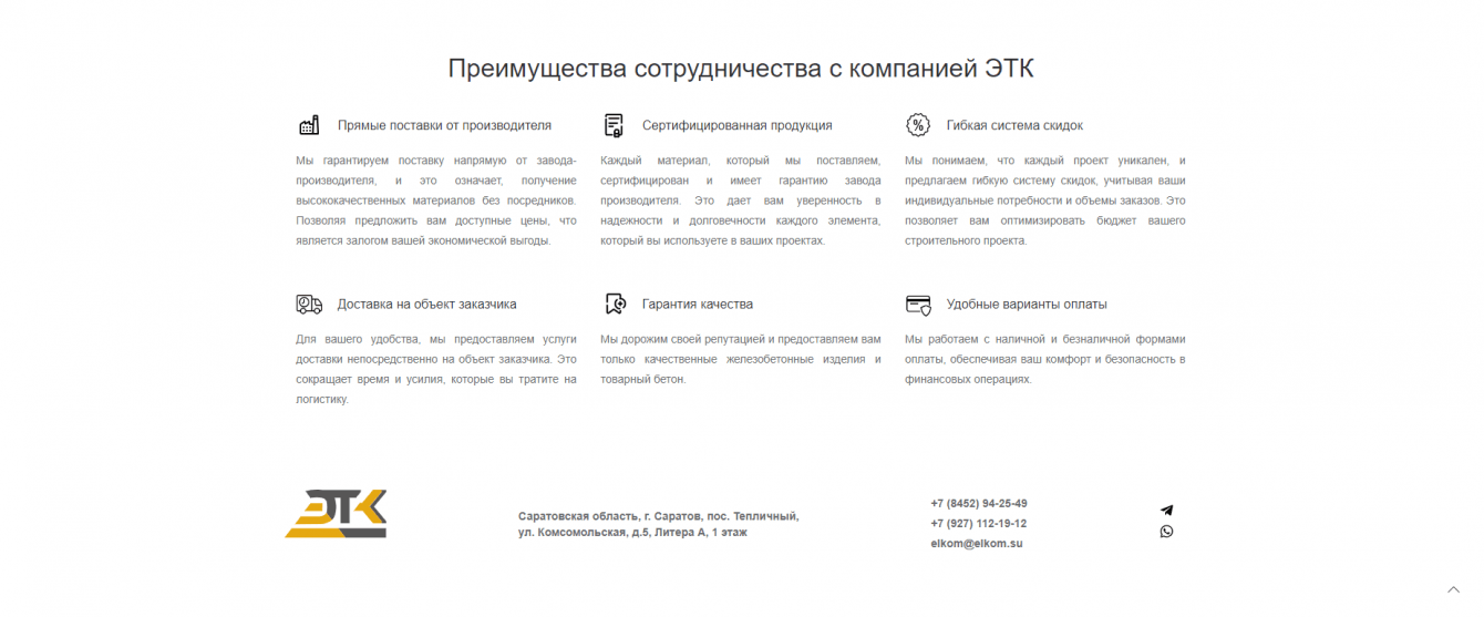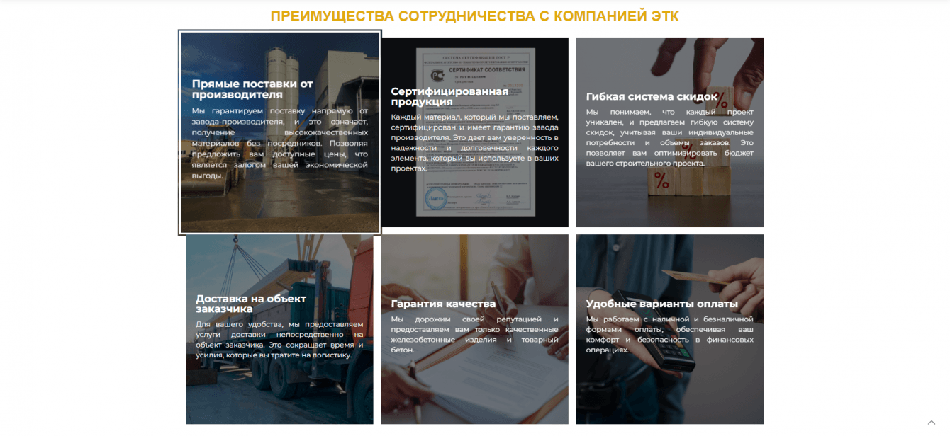 На главной странице мы выделили ключевые преимущества компании, чтобы снизить количество отказов от посещения сайта. Таким образом, посетитель сразу же видит, почему стоит выбрать именно эту компанию.