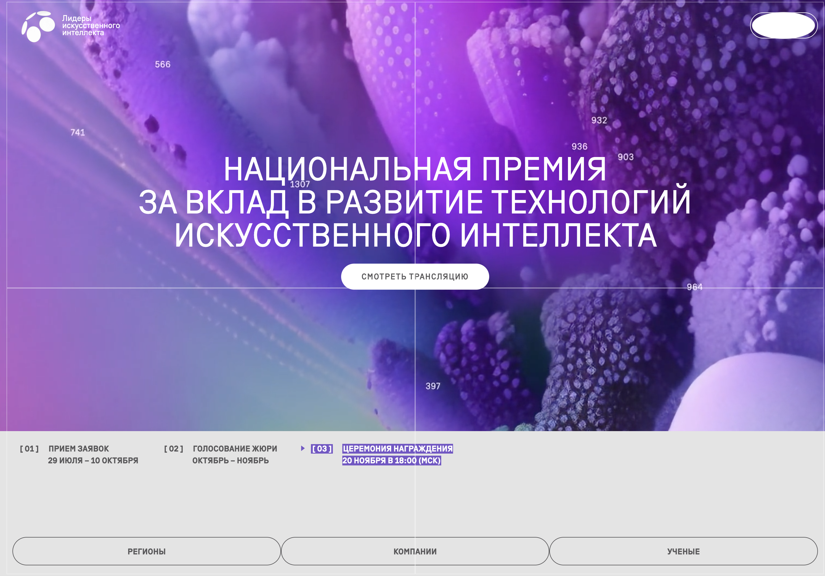 Необходимо разработать и запустить сайт премии «Лидеры искусственного интеллекта». Сайт будет использоваться для приёма и обработки заявок от зарегистрированных участников (компаний, регионов и учены), организации онлайн-голосования членов жюри, а также для публикации всей информации о проведении премии.