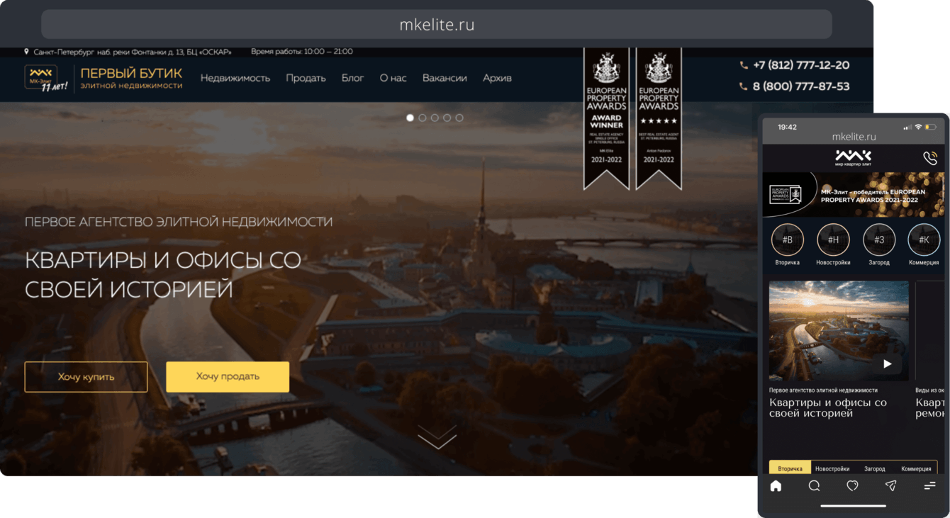 Заказчик пришёл к нам с уже давно работающим сайтом. Мир Квартир — одна из крупнейших риэлторских компаний в Санкт-Петербурге, а Первый Бутик элитной недвижимости — проект Мира Квартир по продаже очень дорогих объектов. Сайт для такой “особенной” ниши должен быть соответствующий. По этому, перед нами стояла следующая цель: разработать сайт с интересным и премиальным дизайном, эффектами и понятной структурой.