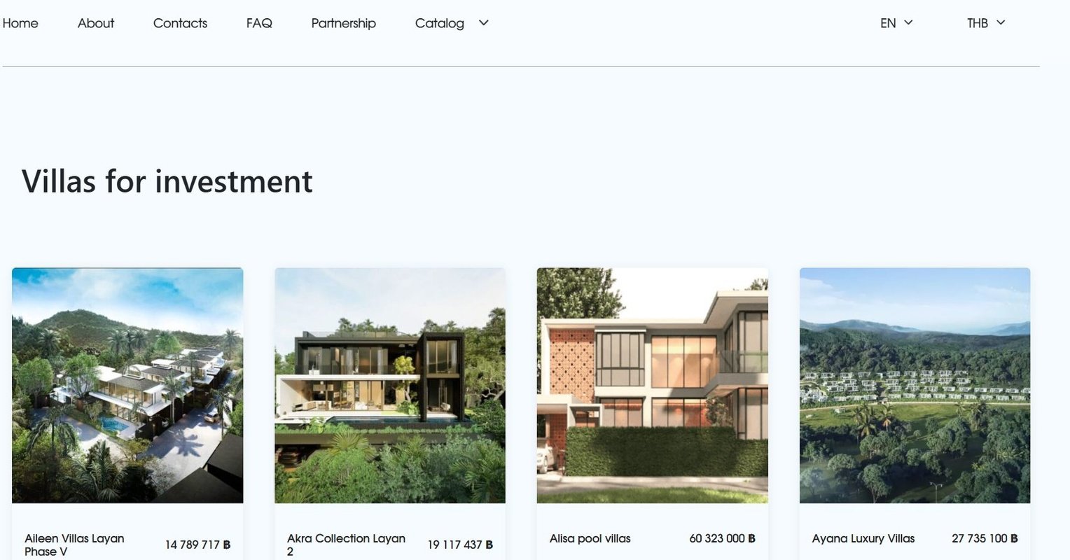 Клиент просил сделать сайт с недвижимостью который он сможет скидывать клиентам. Сайт должен был быть сделан на основании индивидуального дизайна на двух языках английском и русском, а также иметь возможность конвертировать валюту рубли/баты/доллары. Кроме того, необходимо было спарсить и реализовать на сайте каталог недвижимости.