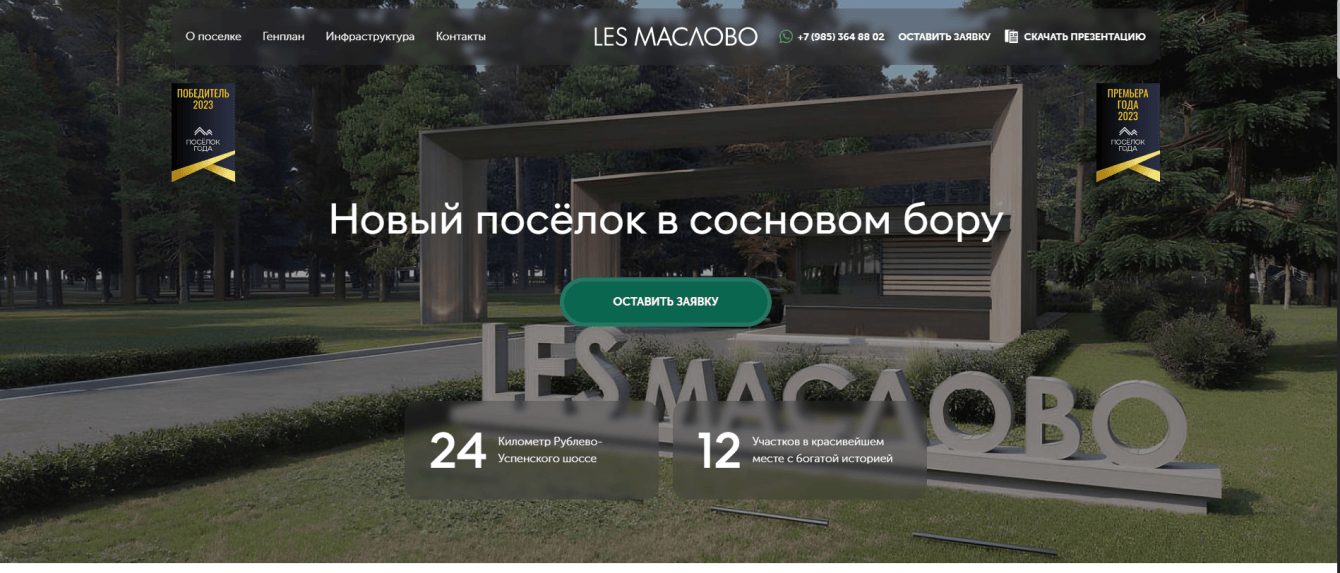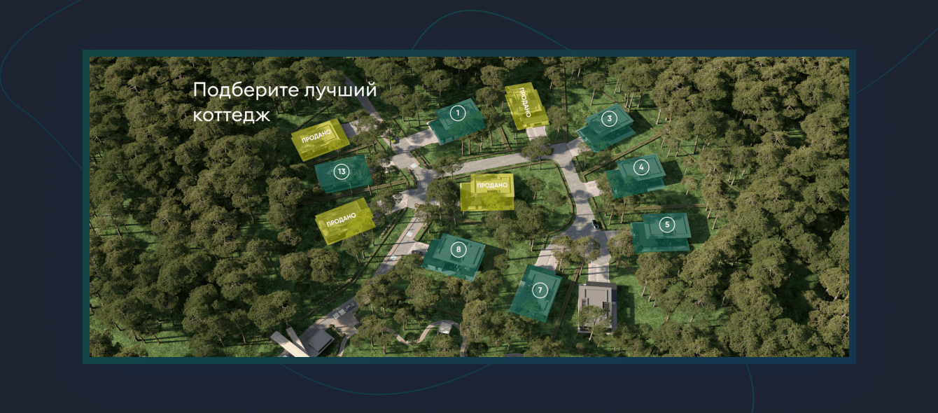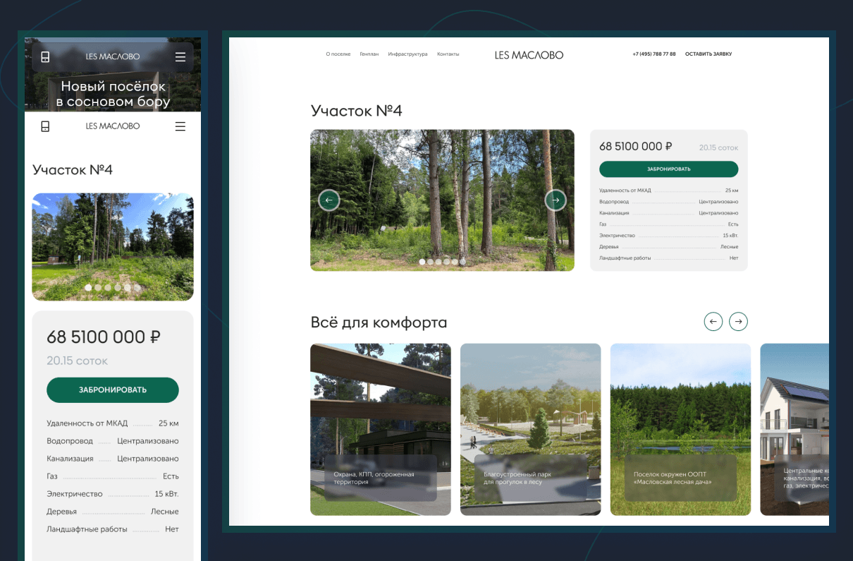 Разработать для клиента лендинг пейдж, показать все плюсы поселка, создать карту участков в поселке с подробным описанием о каждом участке и возможностью забронировать