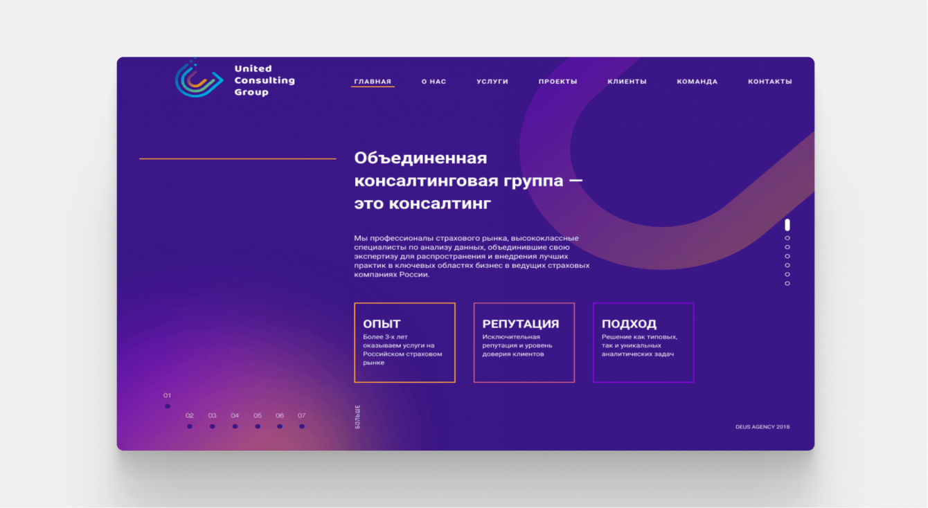 Объединенная консалтинговая группа оказывает услуги анализа и аналитики данных, разработки стратегии и управления бизнесом. Компания обратилась к нам за разработкой дизайна и сайта. Мы решили рассказать о сложных вещах просто и понятно, а также сделать такой интерфейс, чтобы пользователи могли легко ориентироваться в разделах и находить нужную им информацию. В результате сайт получился ярким, функциональным, информативным.