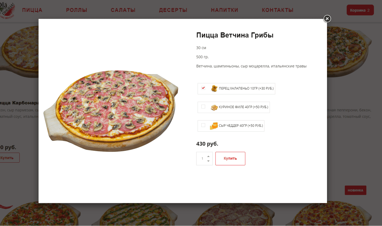 Разработать сайт по заказу пиццы и роллов. Необходима оплата онлайн, выбор способа доставки и интеграция с crm.