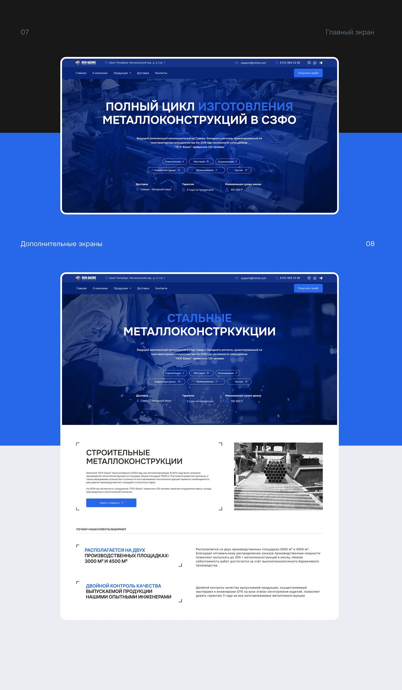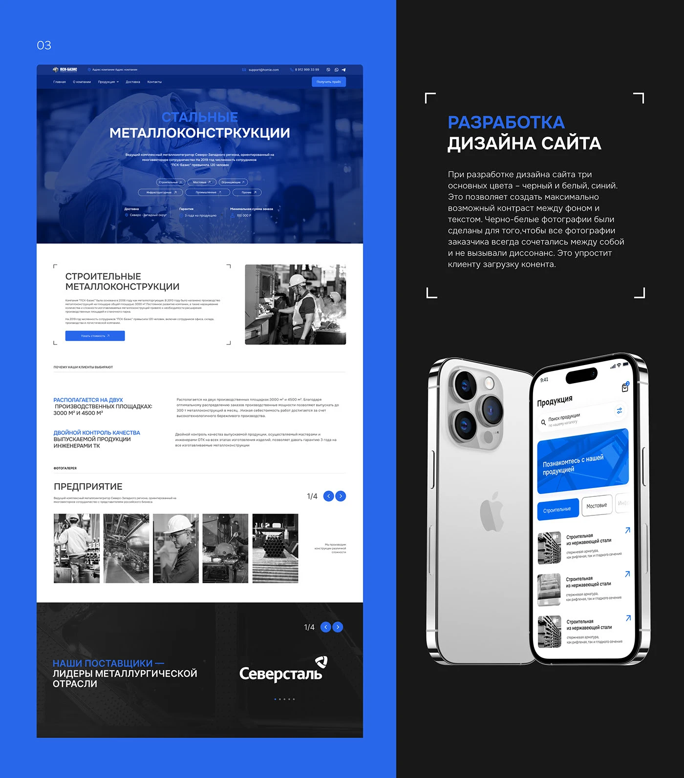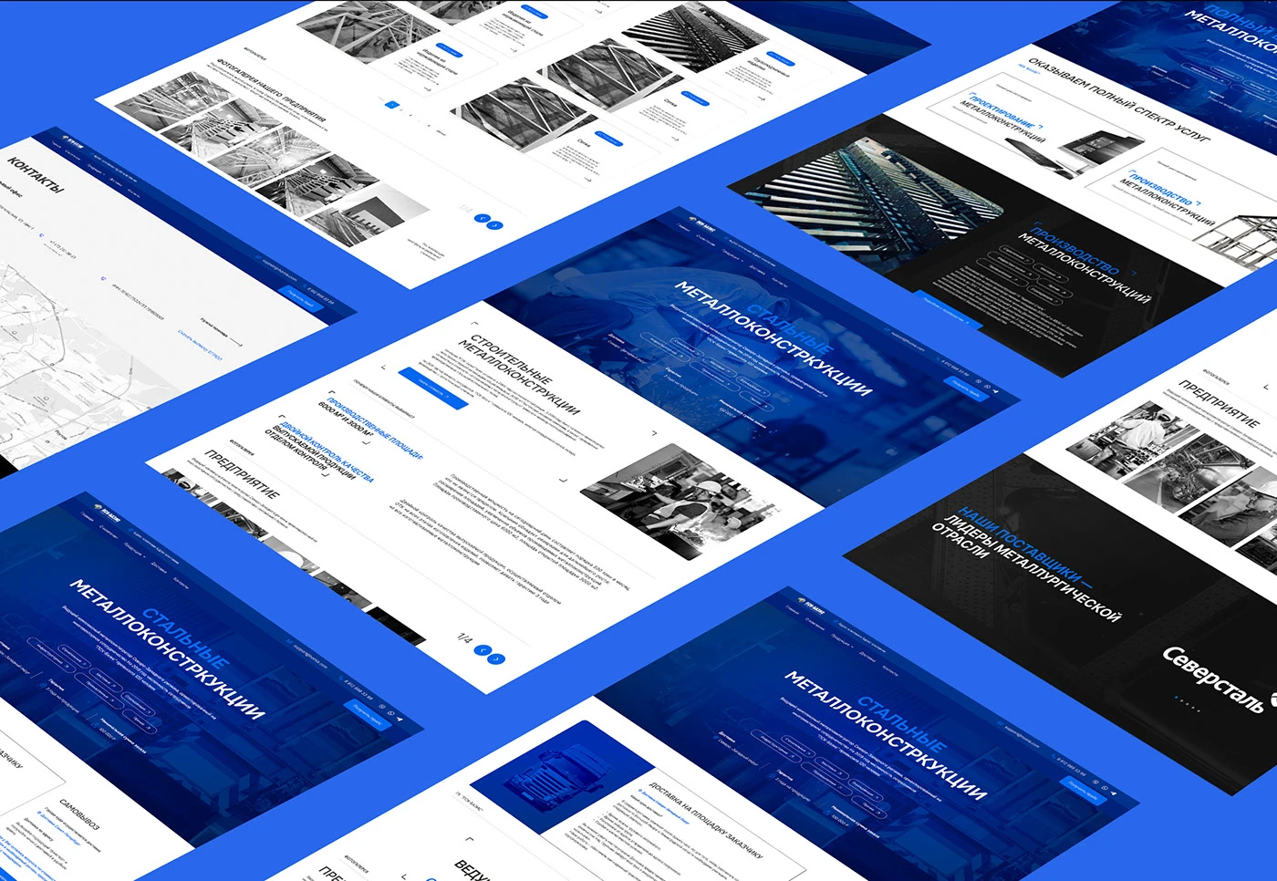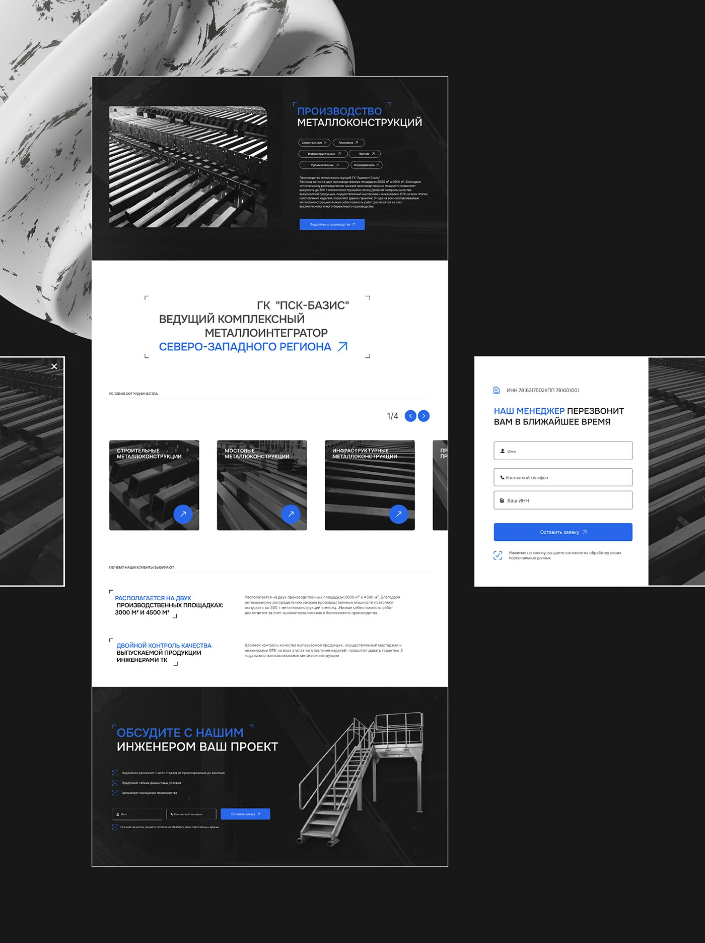 Разработаны оригинальные макеты в Figma для десктопных и мобильных устройств. Визуальный стиль выстроен в строгой индустриальной эстетике: тёмная палитра с металлическими акцентами, лаконичная типографика, крупные производственные фотографии в качестве фоновых элементов. Сайт реализован с применением технологии адаптивной вёрстки, что обеспечивает корректное отображение на любых устройствах — от настольных компьютеров до смартфонов — и положительно влияет на позиции в поисковых системах.