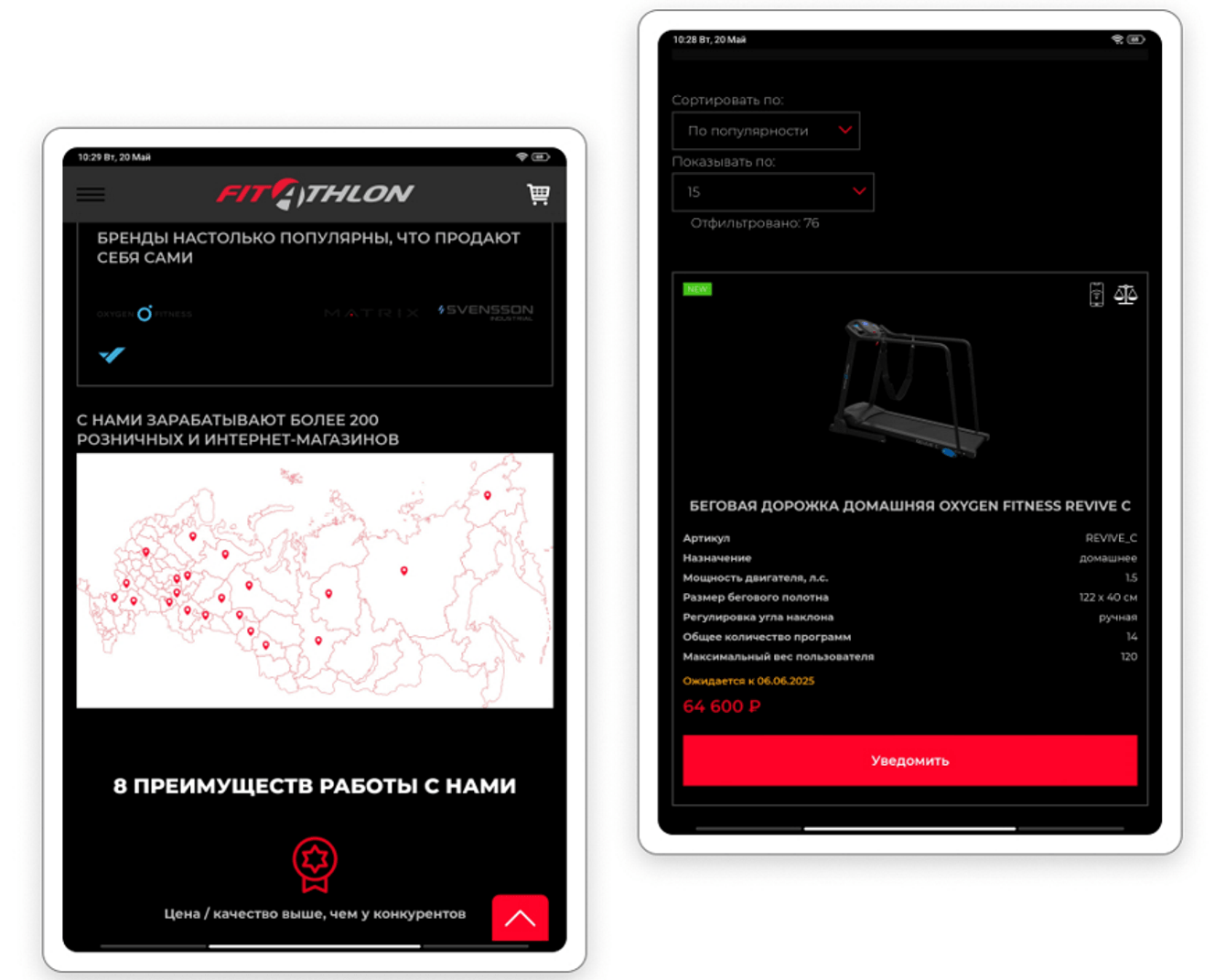 Плотное ежедневное сотрудничество и погружения нас, как экспертов в отрасли Web-разработки в комбинации с Заказчиком как экспертов в комплексном оснащении спортивных залов, фитнес-клубов, тренажерных залов «под ключ» помогло создать функциональный Интернет-ресурс в помощь целевой аудитории Заказчика: собственников и управляющих фитнес-центров, руководителей спортивных клубов и простых граждан Российской Федерации, занимающихся спортом.