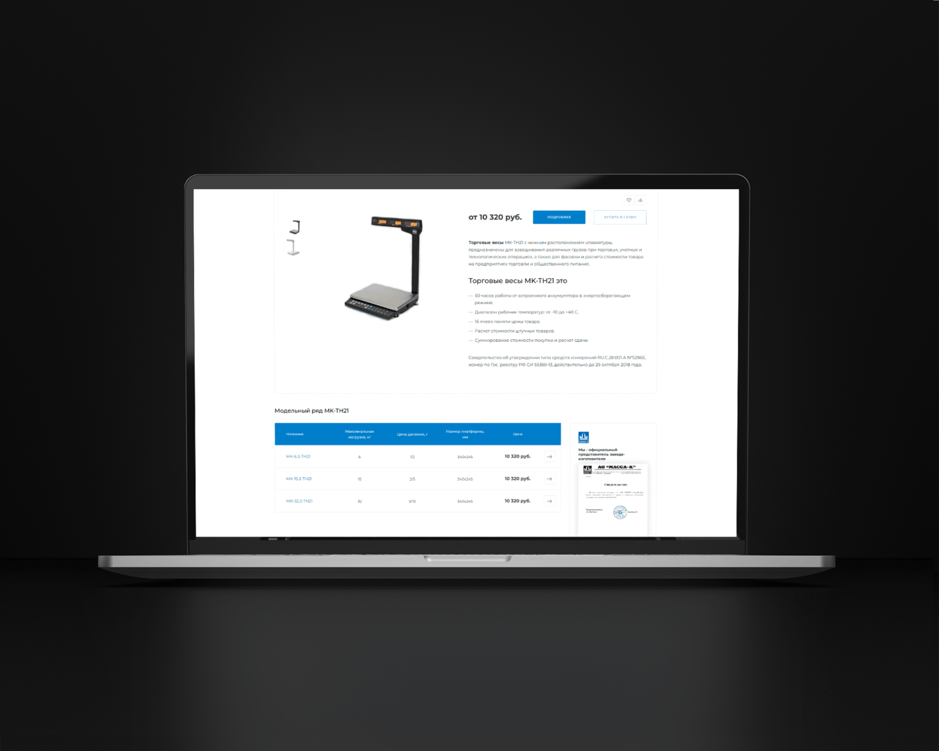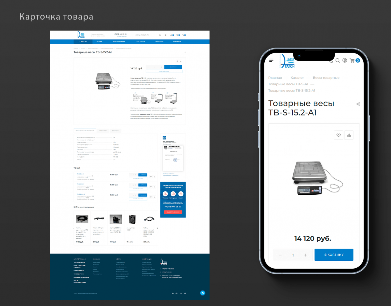 Проработанная карточка товаров с торговыми предложениями, характеристиками, документами, блоком с товарами для данных весов.