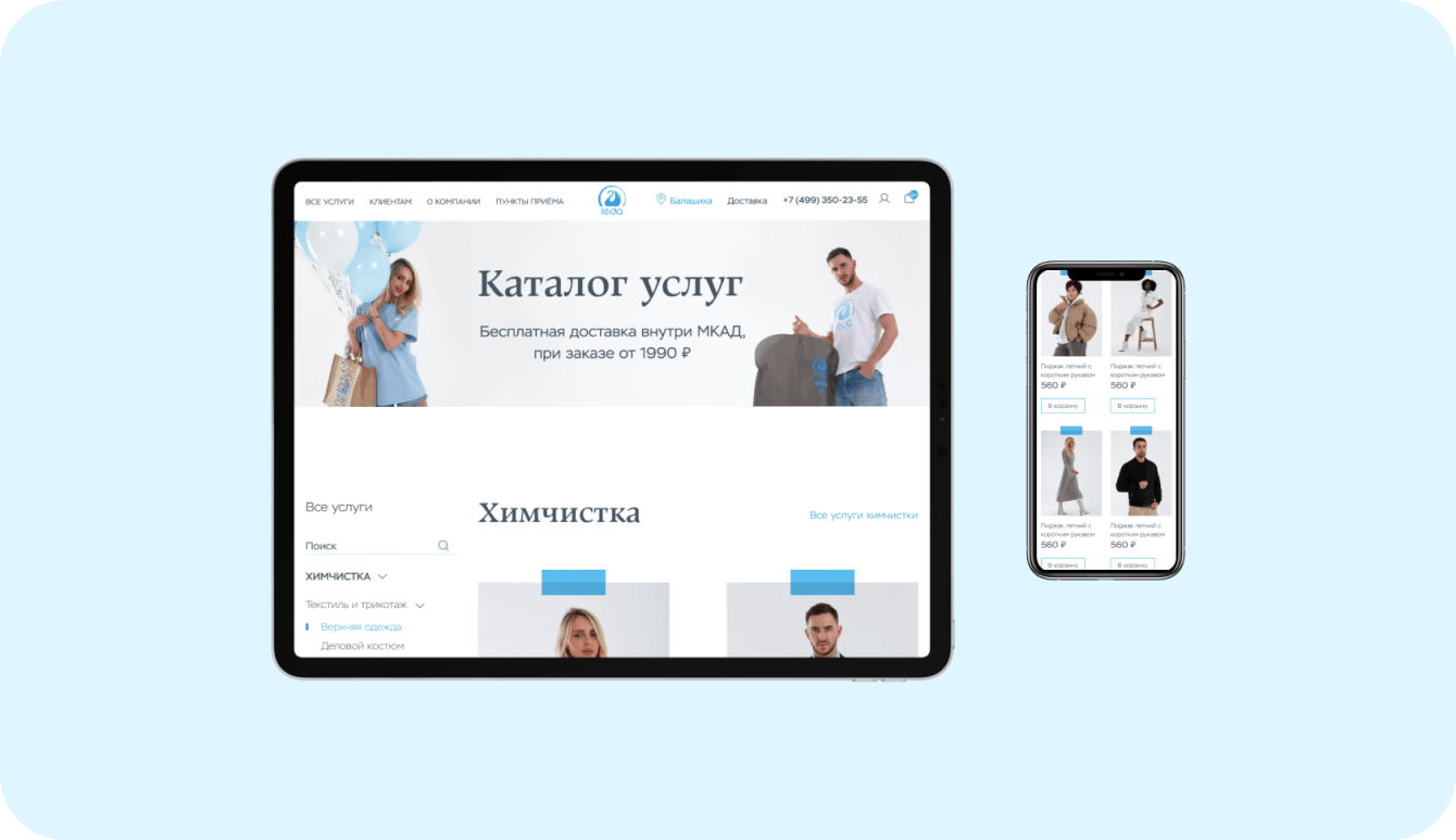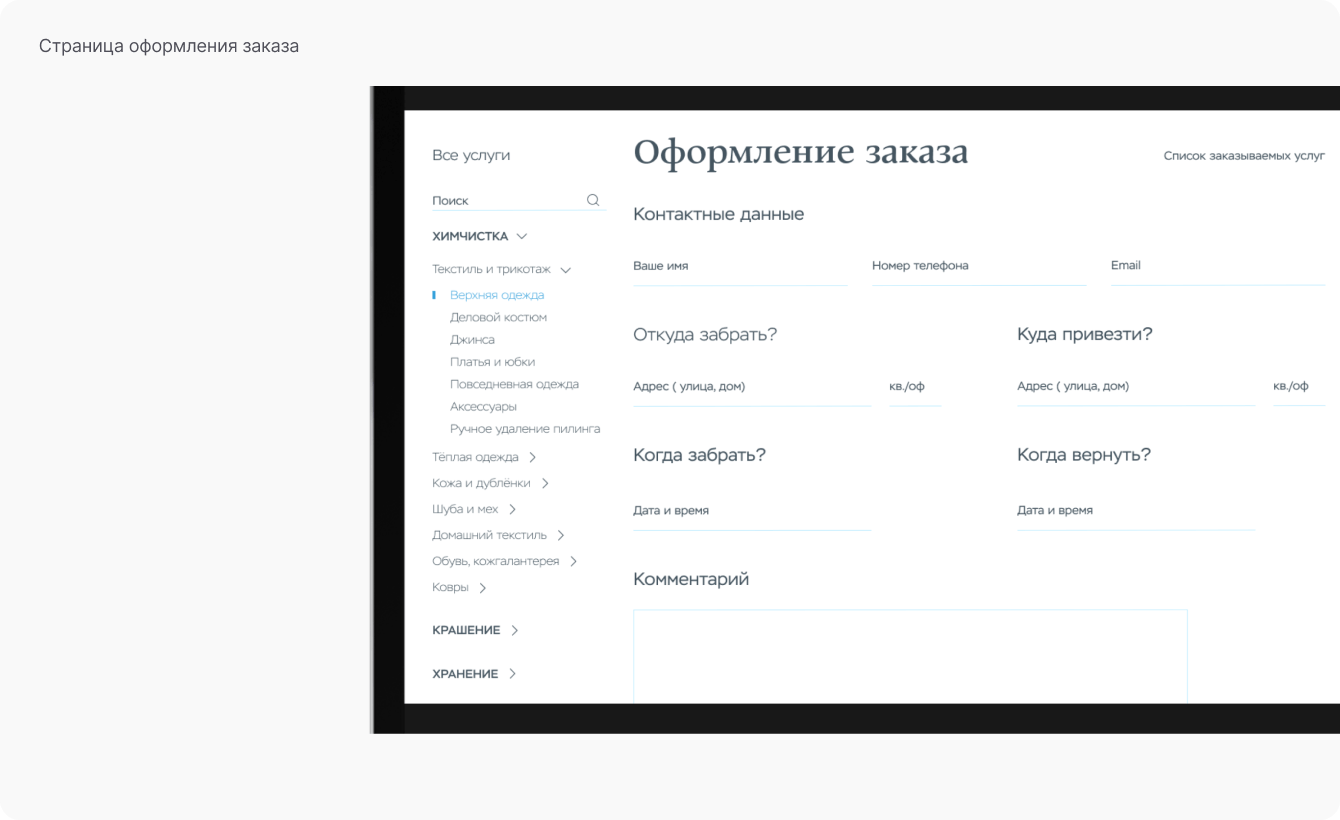 Компания предоставляет услугу химчистки с возможностью доставки. В связи с этим была создана специальная страница для оформления заказов, где пользователи могут удобно заказать химчистку с доставкой прямо на дом.