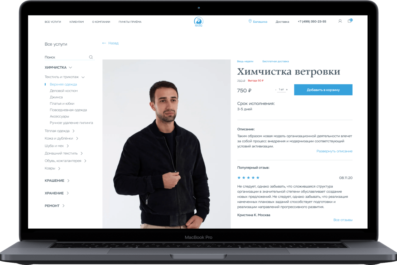 Разработка функционального сайта для химчистки «Leda», который упростит для клиентов процесс заказа услуг, в том числе услуги химчистки с доставкой. Сайт должен отражать опыт и надежность бренда, предоставляя всю необходимую информацию о предлагаемых услугах и их преимуществах.