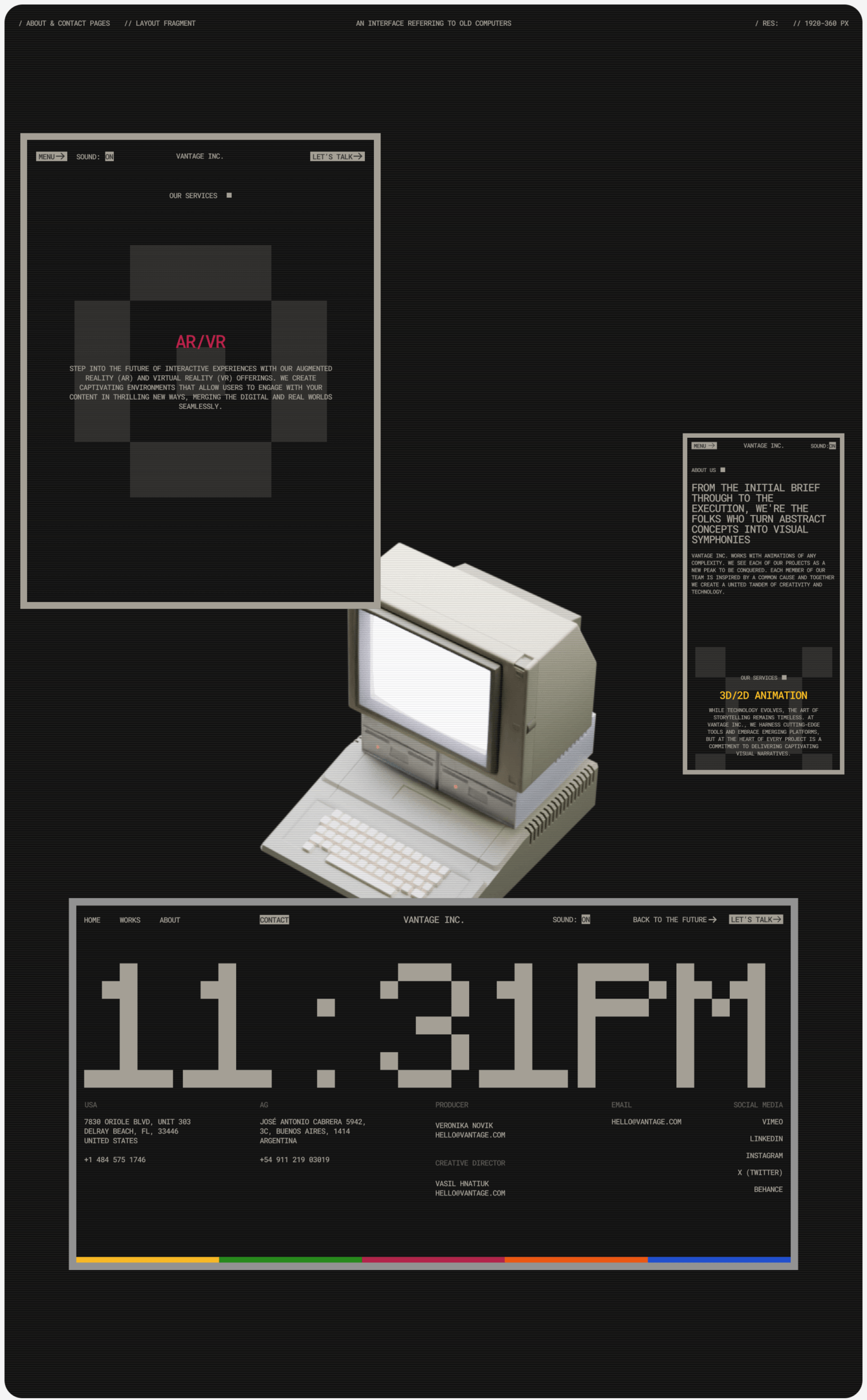 Прямо перед началом работ над сайтом, у Vantage случился ребрендинг, который делает отсылку к технологической революции 90-х годов, когда появились первые компы Apple с цветным дисплеем. Но при этом, сами ребята хотели транслировать, что они работают с современными технологиями, кроме этого еще и создавая инновационные решения для продакшен-индустрии.