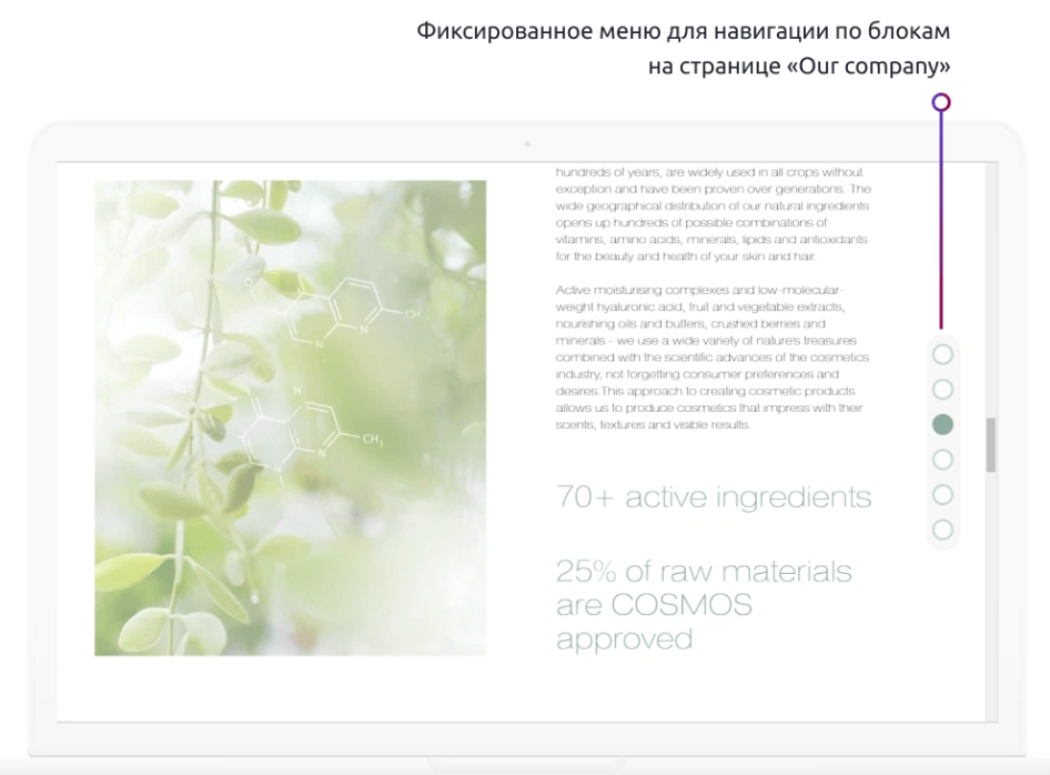 Фиксированное меню для навигации по блокам на странице «Our company».