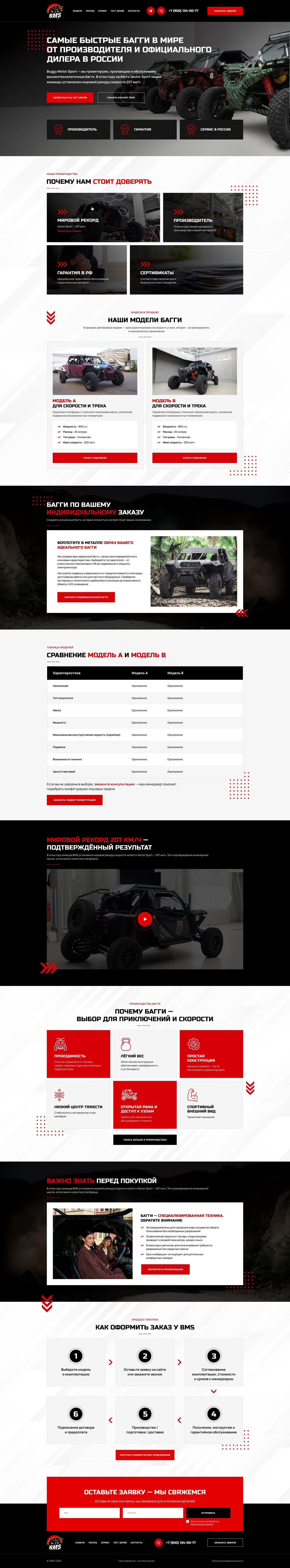 Мы выбрали агрессивный визуальный стиль, созвучный характеру багги: тёмная палитра, глубокие чёрные оттенки, акцентная красная динамика, дополненная светлыми зонами для комфортного восприятия контента. В основу визуала легли реалистичные фотографии и видео. На главной — ролик мирового рекорда скорости на багги. На страницах — полноценная линейка моделей, каждая со своим характером и выразительной подачей.
