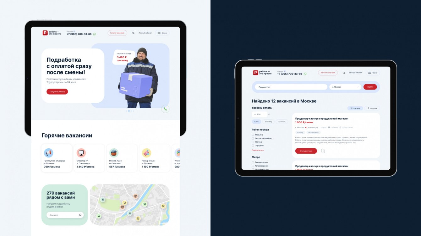 Аудитория компании — люди, которые нуждаются в быстрой подработке. Ключевая потребность пользователей — найти работодателя, с которым можно отработать одну смену и сразу же после этого получить оплату за один день работы. Мы эффектно использовали образы представителей целевой аудитории, чтобы вызывать в пользователе доверие к «Работа — это просто».