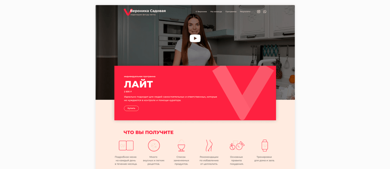 Для Вероники разработали три не похожие друг на друга дизайн-концепции. Выбор был сделан в пользу концепции, которая удачно презентовала ее бренд и рассказывала о возможностях программ питания.