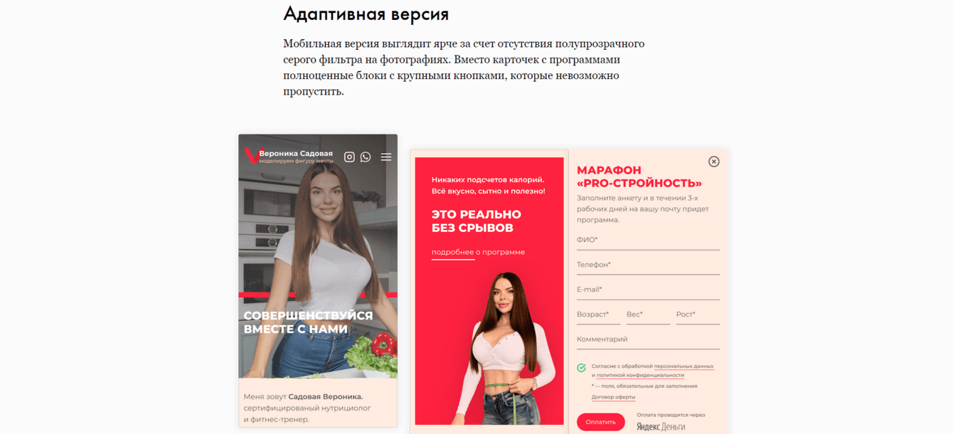 В результате был разработан сайт программы питания, который описывает все ее преимущества и достижения Вероники. Кроме того, приобрести программу можно прямо на сайте, заполнив форму и оплатив.