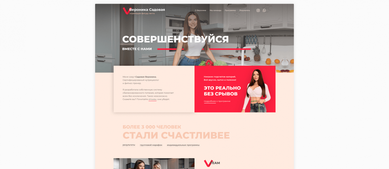 Для Вероники разработали три не похожие друг на друга дизайн-концепции. Выбор был сделан в пользу концепции, которая удачно презентовала ее бренд и рассказывала о возможностях программ питания.