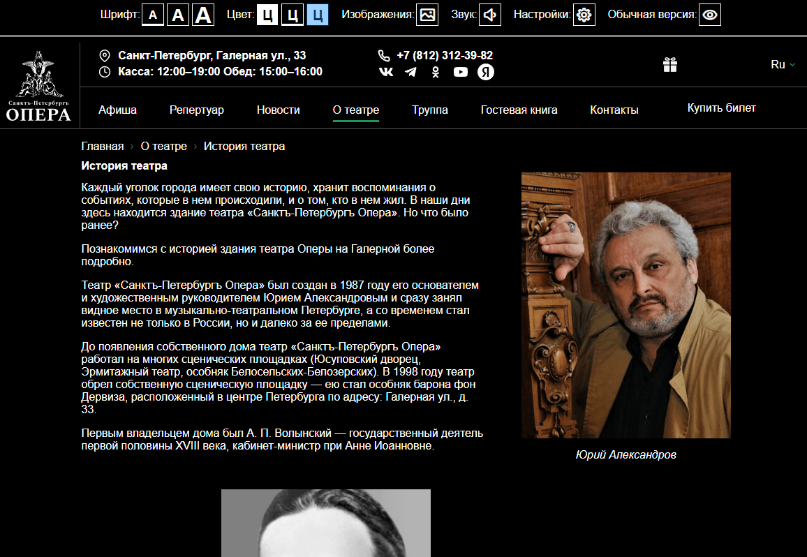 Для решения поставленных задач мы использовали систему управления контентом 1С-Битрикс, которая обеспечила надежное управление сайтом и его содержанием. Мы также разработали интеграцию с сервисом онлайн-продажи билетов для удобства посетителей сайта. Для обеспечения доступности слабовидящим пользователям была создана специальная версия сайта, с учетом стандартов доступности.