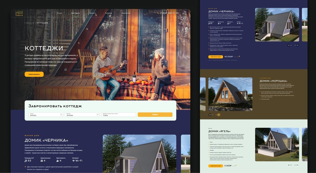 На странице есть блок бронирования, список коттеджей, блок "Услуги", мини-галерея со слайдером случайных фото, мини-блок "О нас" с преимуществами, баннер "Трансфер",