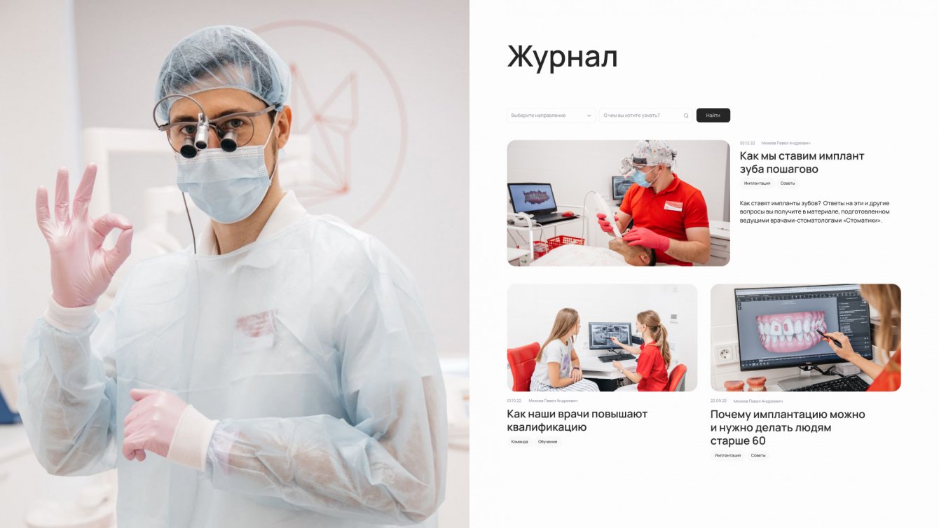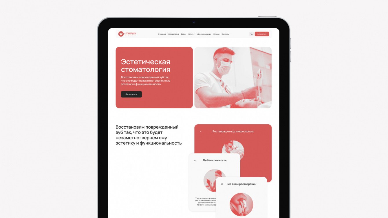 Стоматика — бизнес, объединяющий человечность и технологичность. В коридорах клиники играет легкое техно, цвета погружают в атмосферу уютного хай-тека, а открытые ко всему врачи встречают пациентов улыбками. Именно эту комплексную атмосферу передает новый сайт.