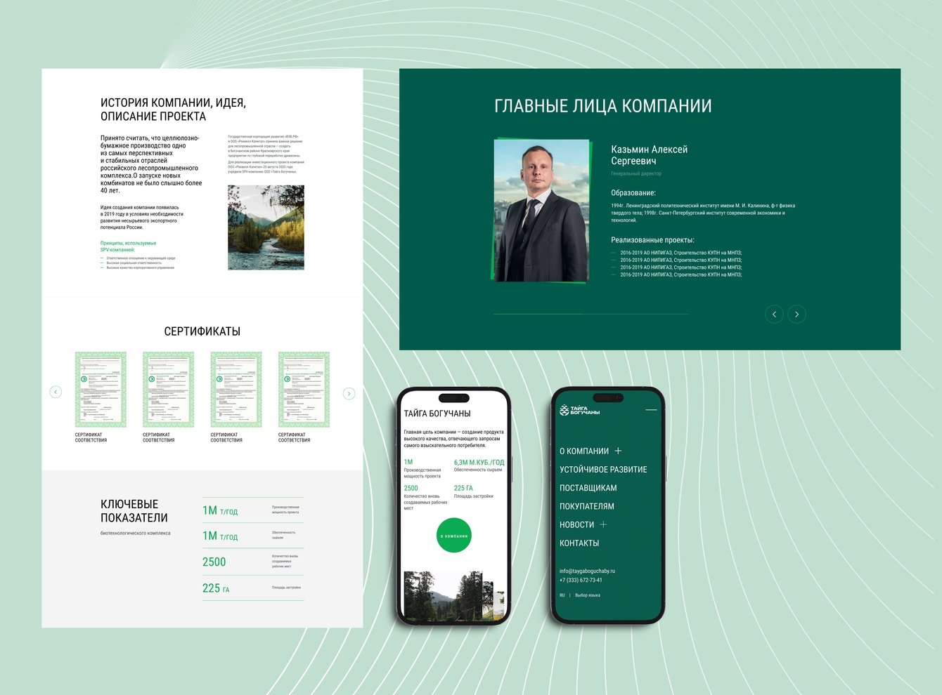 «Тайга Богучаны» — это биотехнологический комплекс по глубокой переработке древесины. Цель проекта заключалась в создании гармоничного и визуально привлекательного сайта, который отражал бы концепцию, суть деятельности компании, и подчеркнул её экологичность.