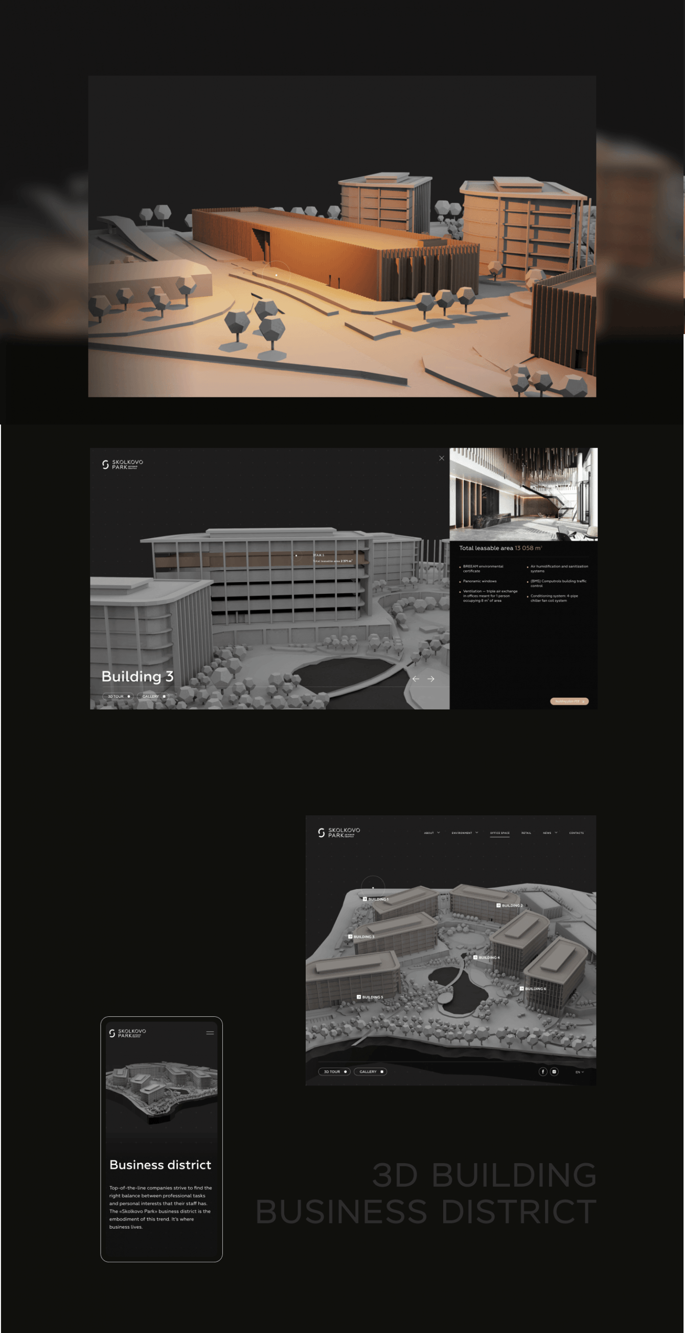Разработали полномасштабную интерактивную 3D-модель комплекса с нуля, опираясь на 2D-план застройки квартала и видео-модель с облётом. Важно было совместить эстетику и максимальную лёгкость: сделали выбор в пользу низкой полигональности, тем самым сохранив высокую скорость загрузки и уменьшив потребление памяти. Всё в геометрическом стиле «лоуполи»: схематичные деревья, кубические формы, полный 3D-минимализм.