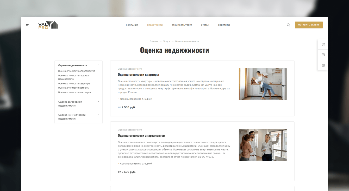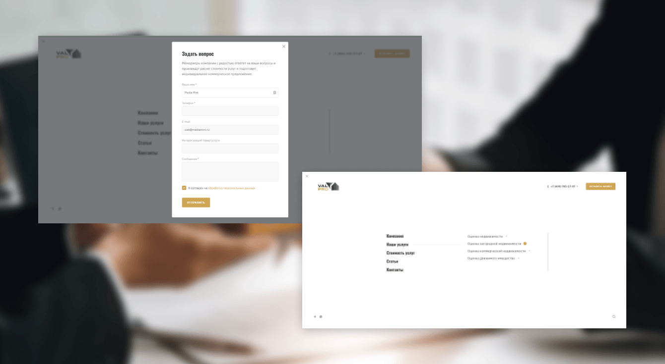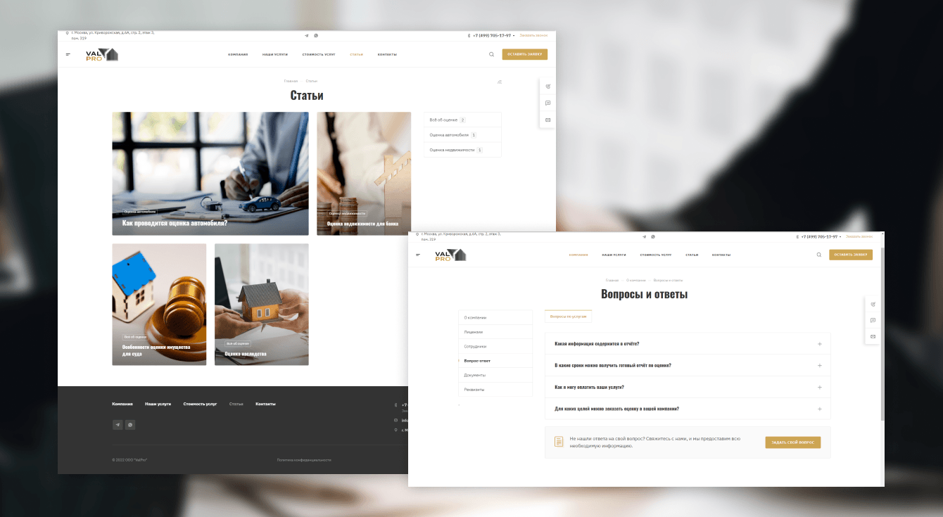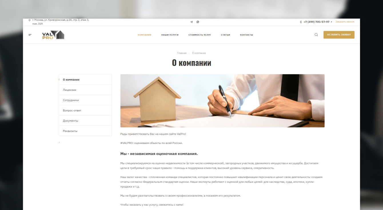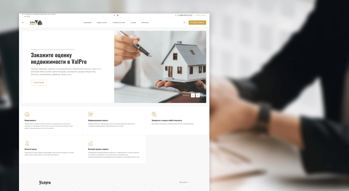 Компании по оценке недвижимого и движимого имущества ValPro нужен был удобный, понятный, информативный и стильный сайт, чтобы заявить о себе в интернете и расширить аудиторию для оказания своих услуг.
