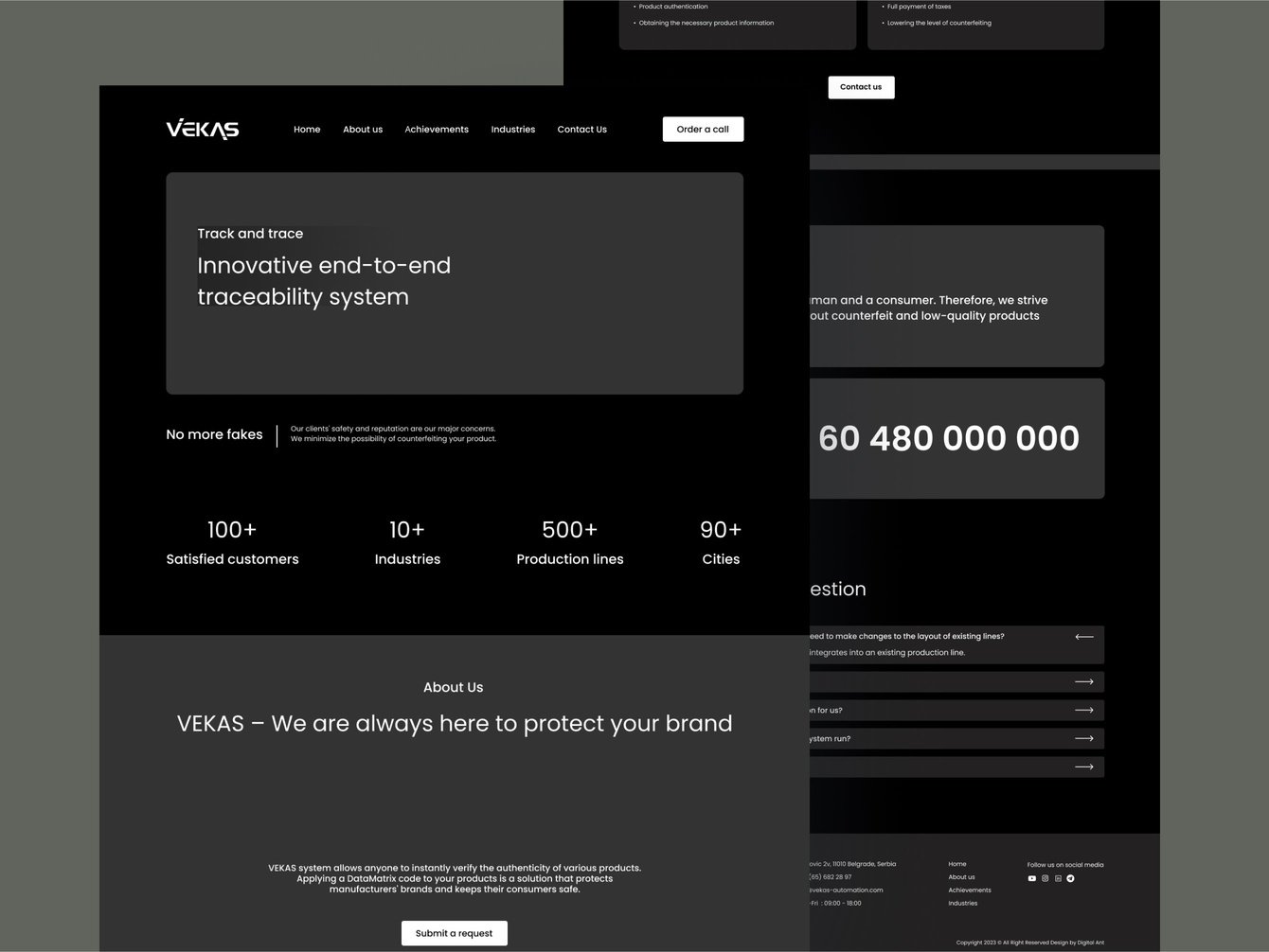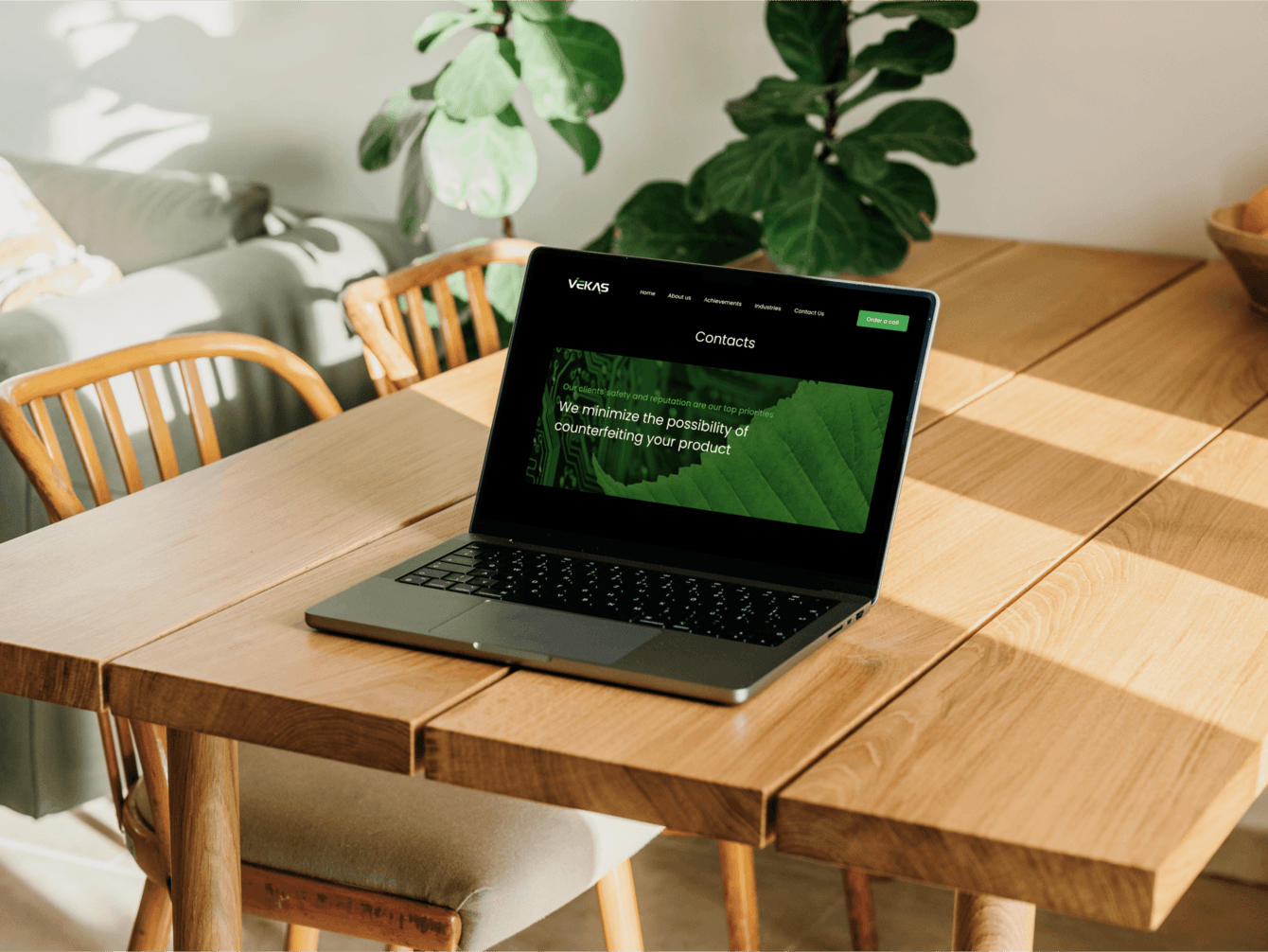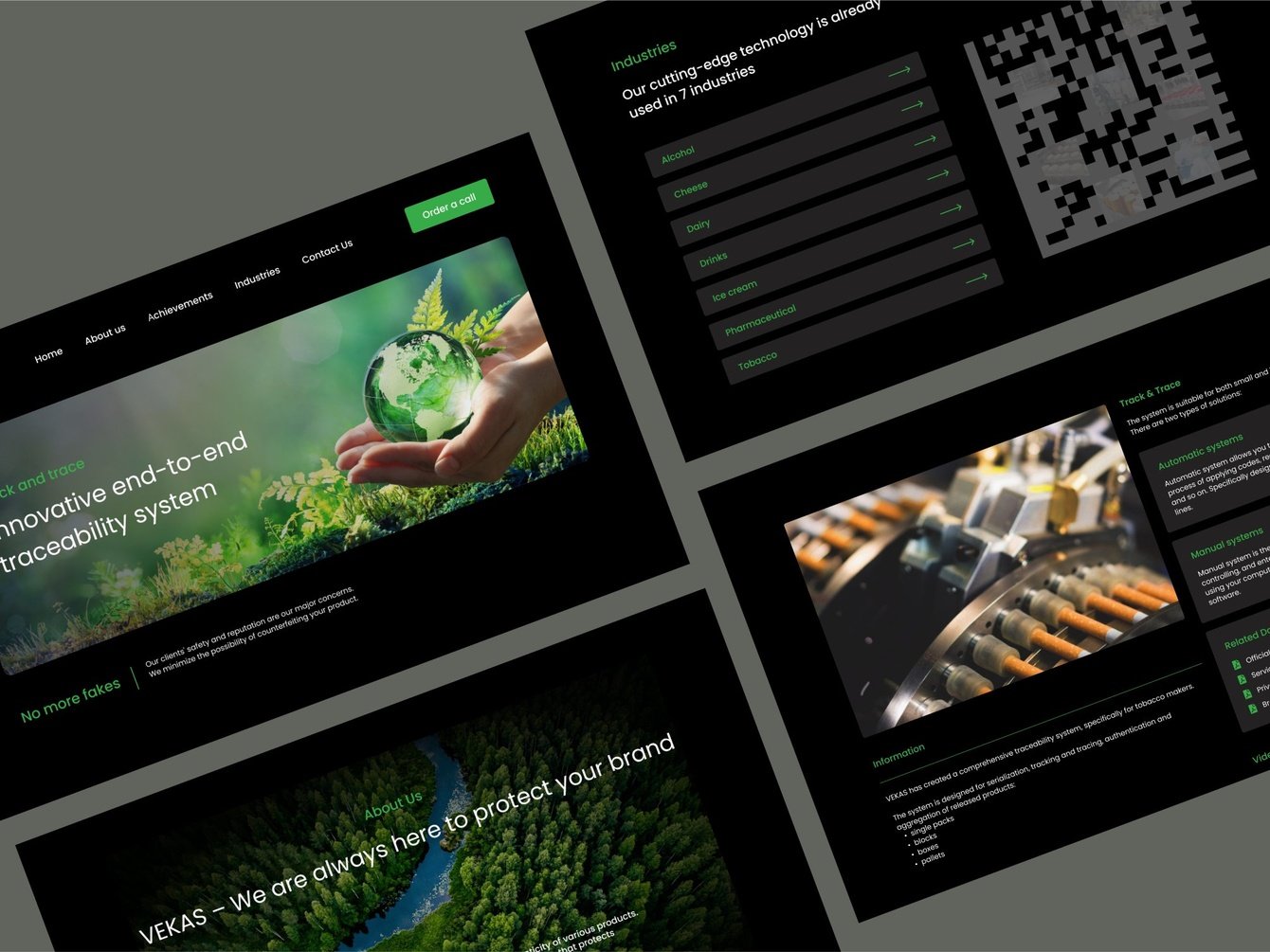Визуальный контент и палитра зеленых оттенков на глубоком черном фоне демонстрирует экологичность и инновационность производственных решений Vekas.