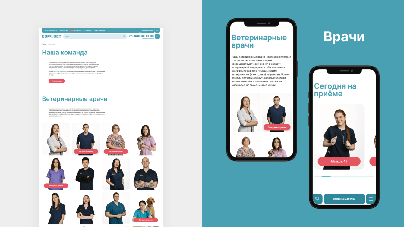 Для каждого врача появилась своя страница, где мы показали его опыт работы, достижения и успехи в учебе и дополнительном образовании, добавили фотографий с приемов, чтобы пользователь мог максимально познакомиться с врачом еще до его приема. Было еще много идей и креативов, но для их реализации должны были быть задействованы ресурсы клиента: например, видео съемка. К сожалению, многое не реализовали. Хорошо, что фотосессию смогли сделать. На практике мы видим, как это сложно просто собрать всех сотрудников в одном месте для общей фотосессии, даже в два этапа.