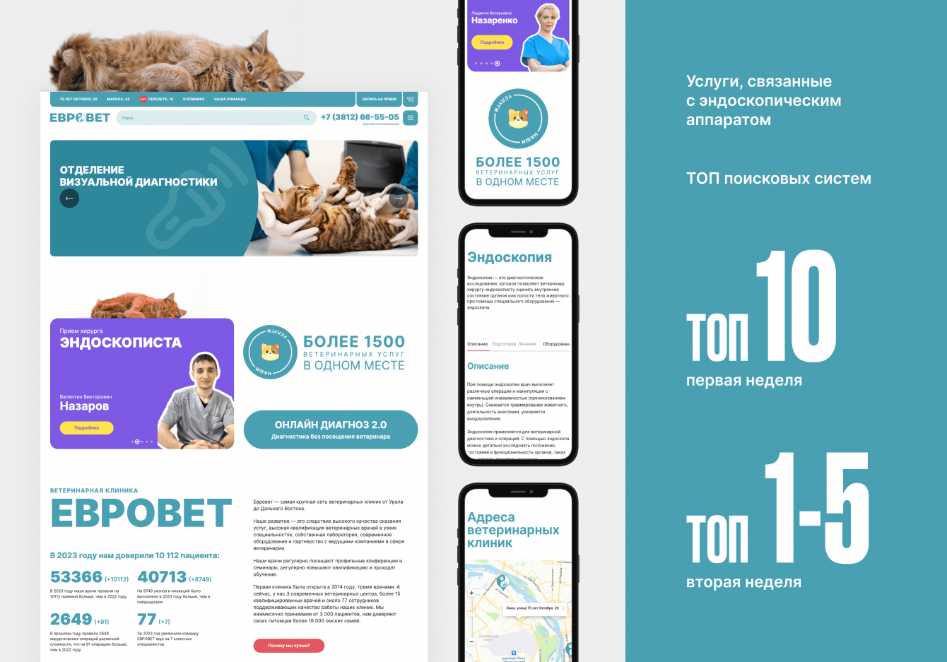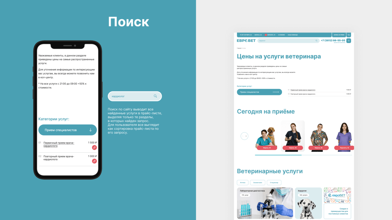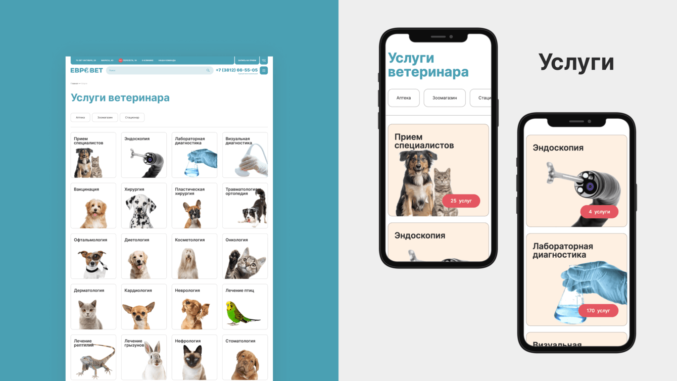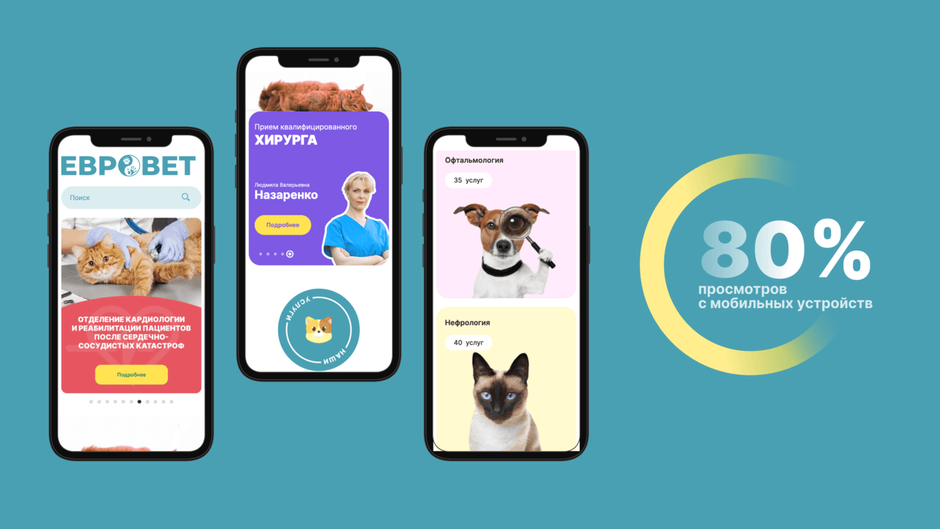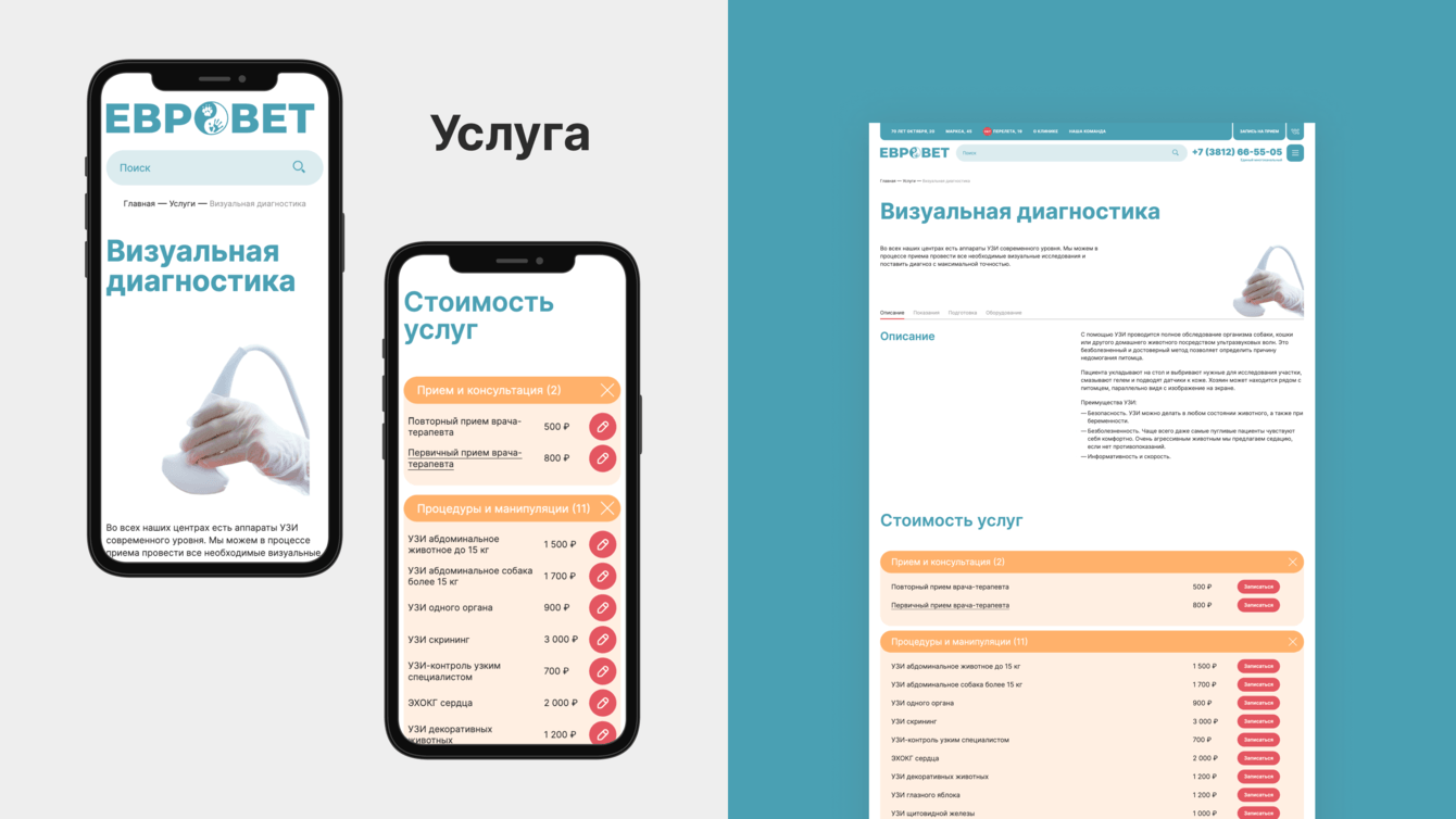 Что требовалось реализовать: современный дизайн с основным упором на мобильный трафик (более 80% от общего числа), расписание врачей, запись на прием на конкретную дату и время, список услуг, общий прайс-лист, возможность удобного обновления данных о ценах и расписании врачей через панель администрирования, пересобрать модуль онлайн-диагностики животных, настроить сайт для сбора статистики. Также важно было учесть накопленный годами контент сайта, позиции сайта в поиске по ключевым словам.