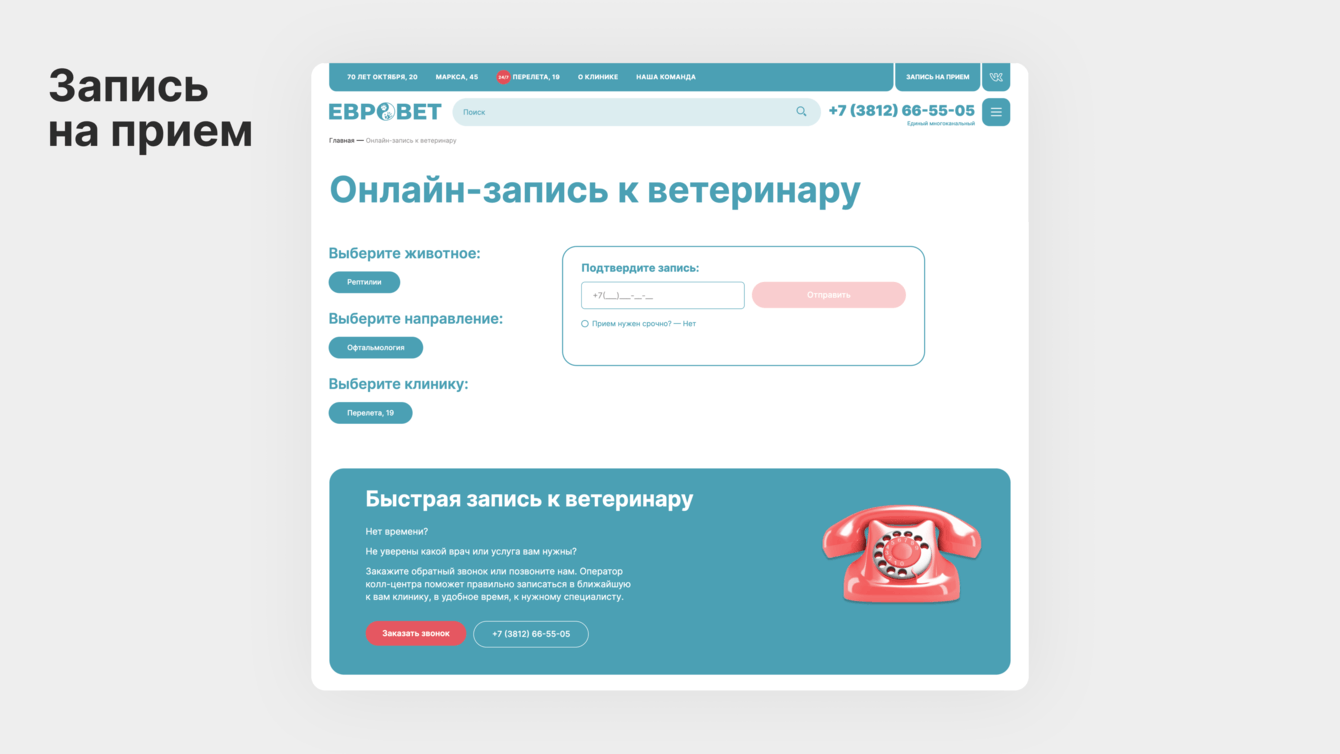 — отдельная страница записи на прием с большой формой с выбором животного, услуги и клиники;