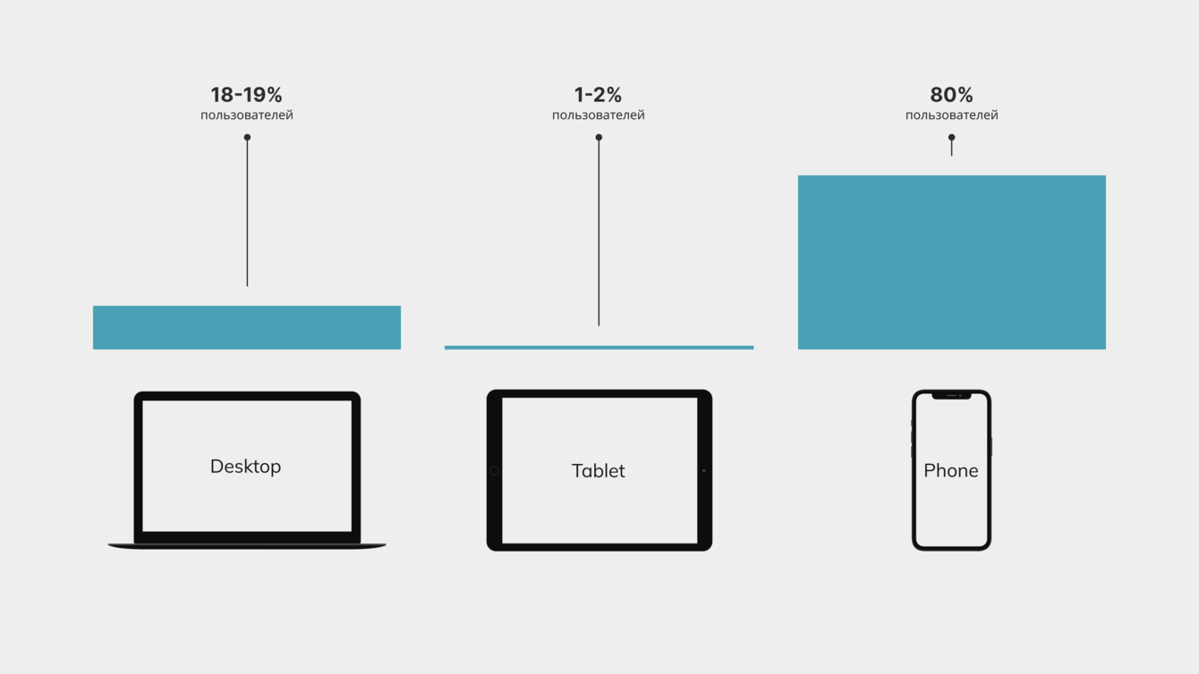 В результате проведенного этапа мы определили, что основной трафик сайта — мобильный (более 80%), пользователи с планшетов составили всего 1-2% от общего числа, остальное забрал десктоп.