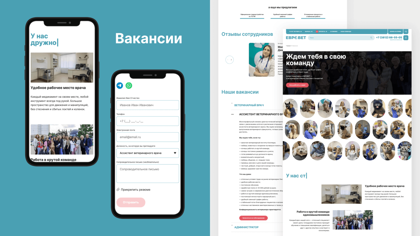В ветеринарной клинике ЕВРОВЕТ особое внимание уделяется врачам и команде в целом. В коллективе царит дух единства и общего дела. На странице вакансий мы постарались передать этот дух всем, кто ищет работу или хотел бы профессионально развиваться в хорошей компании.